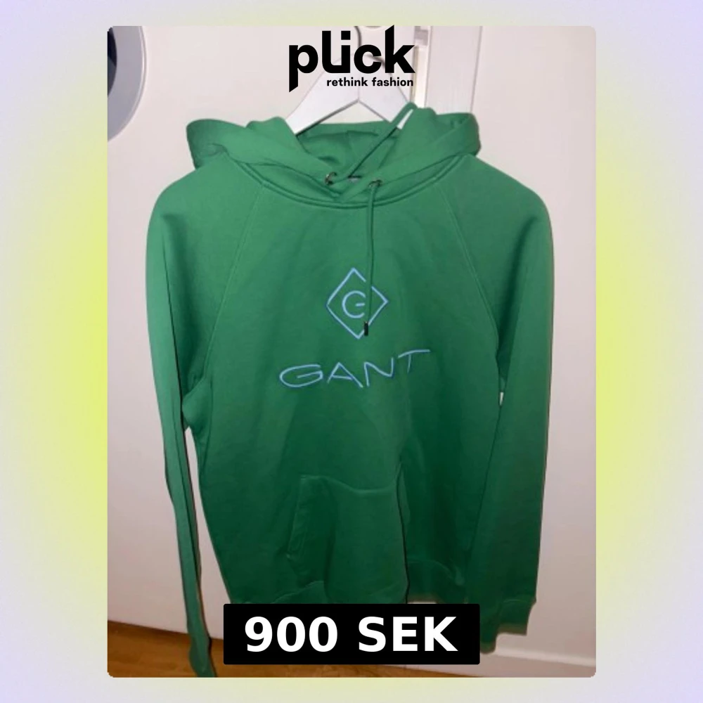 Snygg grön hoodie från GANT i storlek L. Tröjan har en stor huva med snörning, klassisk känguruficka och blå broderad GANT-logga på bröstet. Tillverkad i mjuk bomull, perfekt för chill dagar. Passformen är normal och ärmarna är långa.