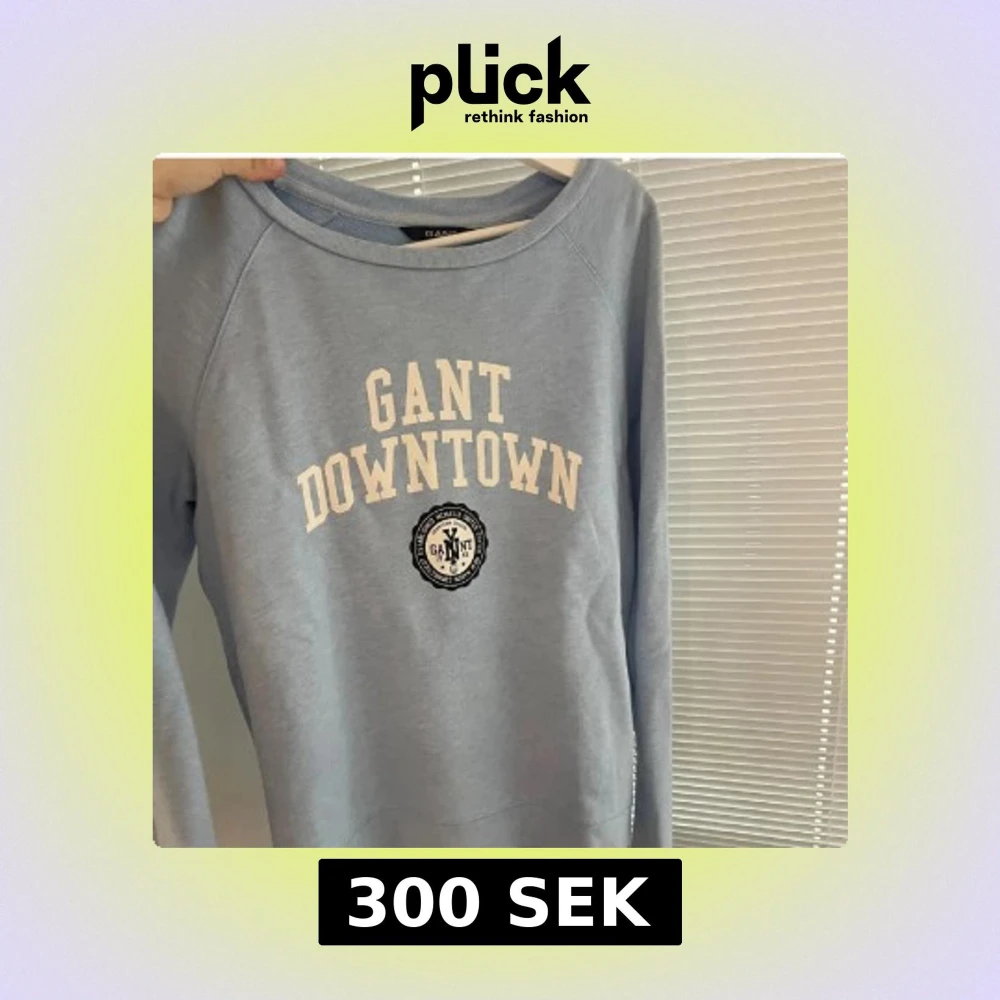 Säljer en snygg blå sweatshirt från Gant med texten 'GANT DOWNTOWN' i vitt på framsidan. Tröjan har långa ärmar och en rund halsringning. Perfekt för en avslappnad stil.
