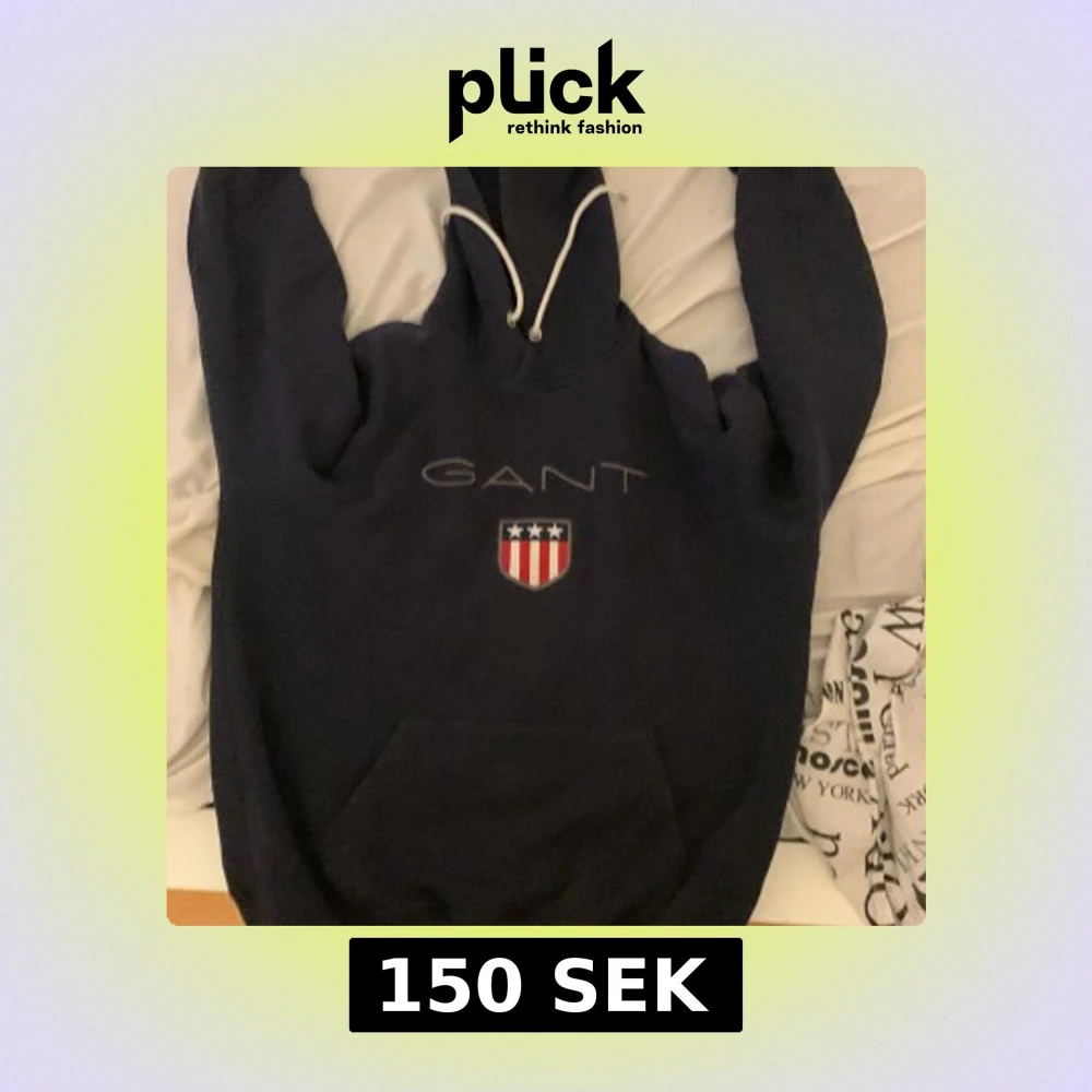 Säljer en marinblå hoodie från GANT med vit snörning i huvan och klassiskt broderat GANT-logo samt sköld med stjärnor och ränder på bröstet. Stor känguruficka framtill och mjukt material, perfekt för chill dagar.
