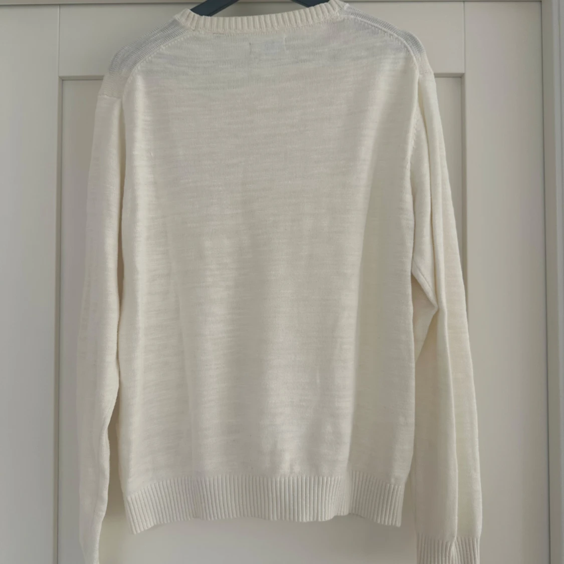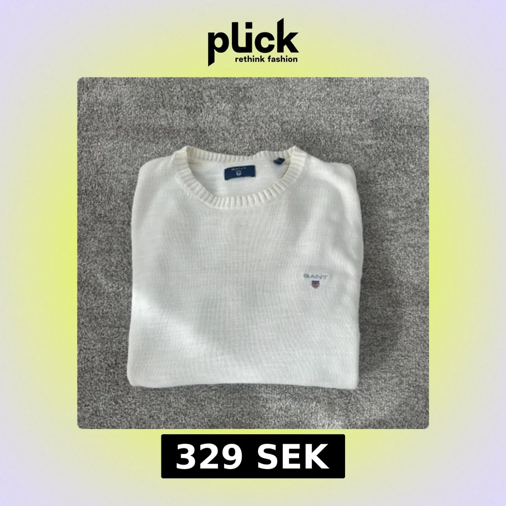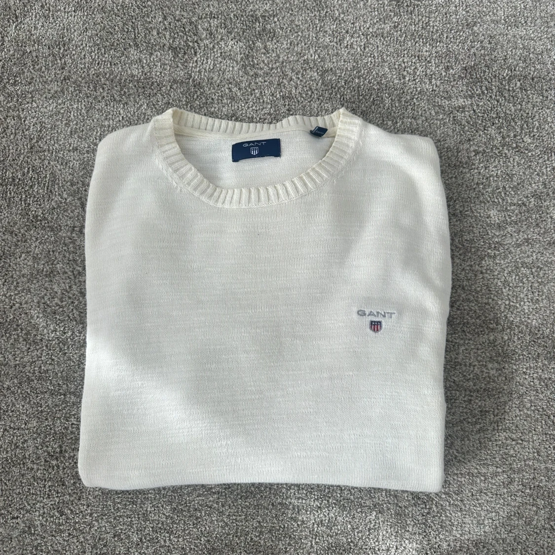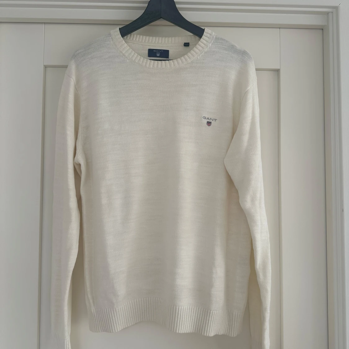 Vit stickad tröja från GANT med rund halsringning och diskret broderad logga på bröstet. Tröjan är i bra skick. Pris kan diskuteras.