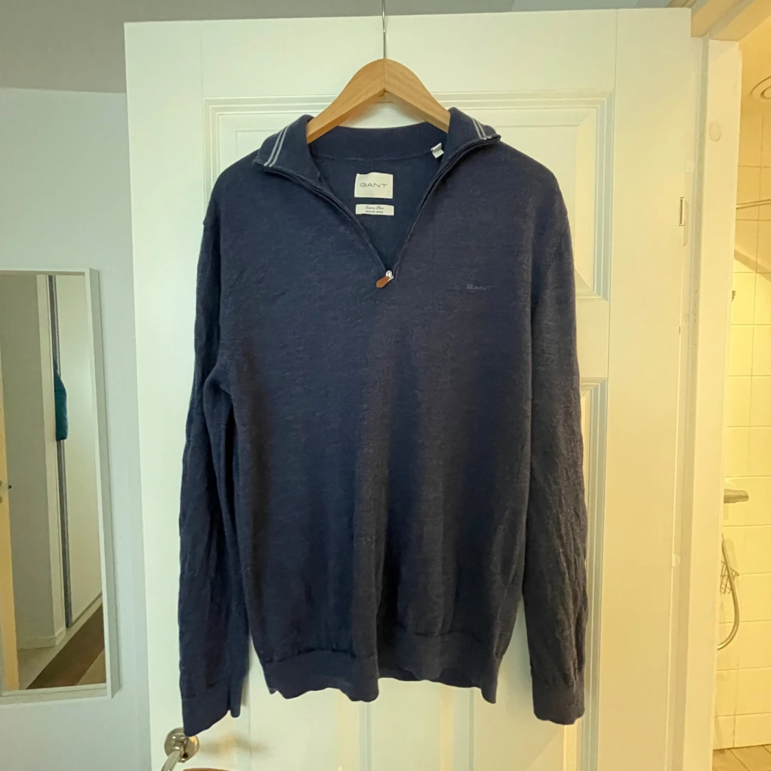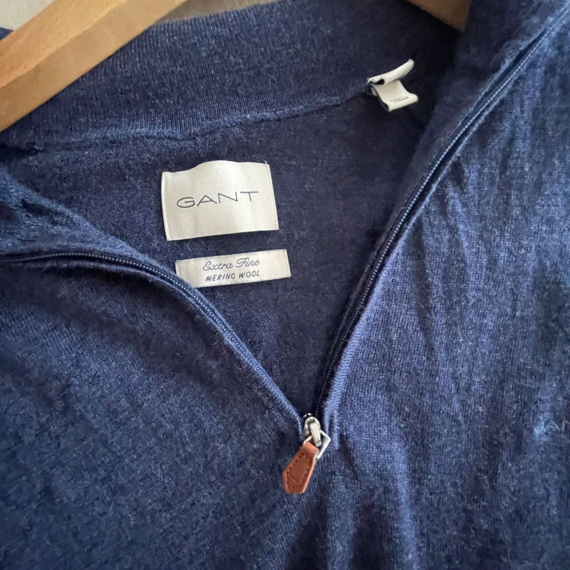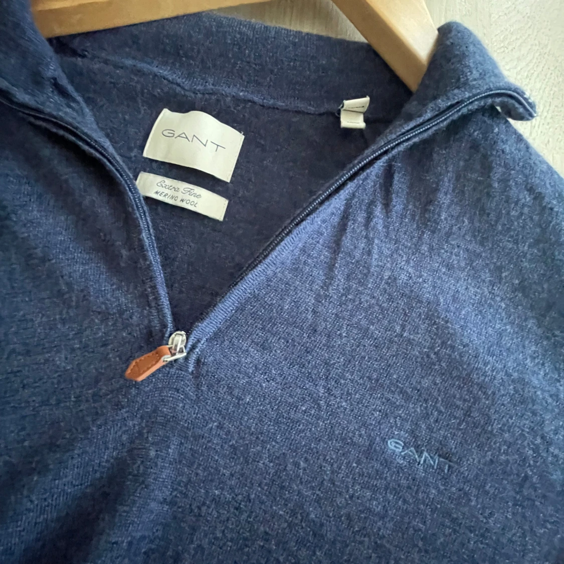 Säljer en marinblå långärmad tröja från GANT i extra fin merinoull. Tröjan har en stilren half zip-dragkedja med läderdetalj och diskret broderad logga på bröstet. Perfekt för lager-på-lager och snygg till jeans eller chinos.