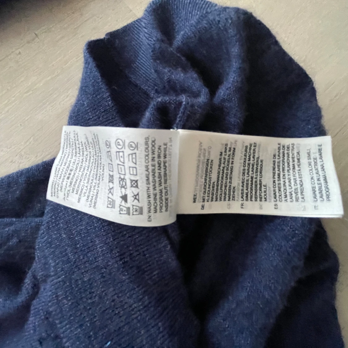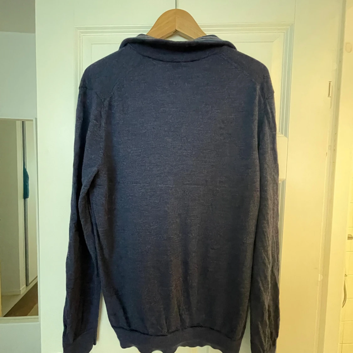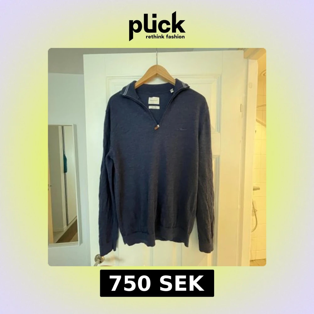 Säljer en marinblå långärmad tröja från GANT i extra fin merinoull. Tröjan har en stilren half zip-dragkedja med läderdetalj och diskret broderad logga på bröstet. Perfekt för lager-på-lager och snygg till jeans eller chinos.