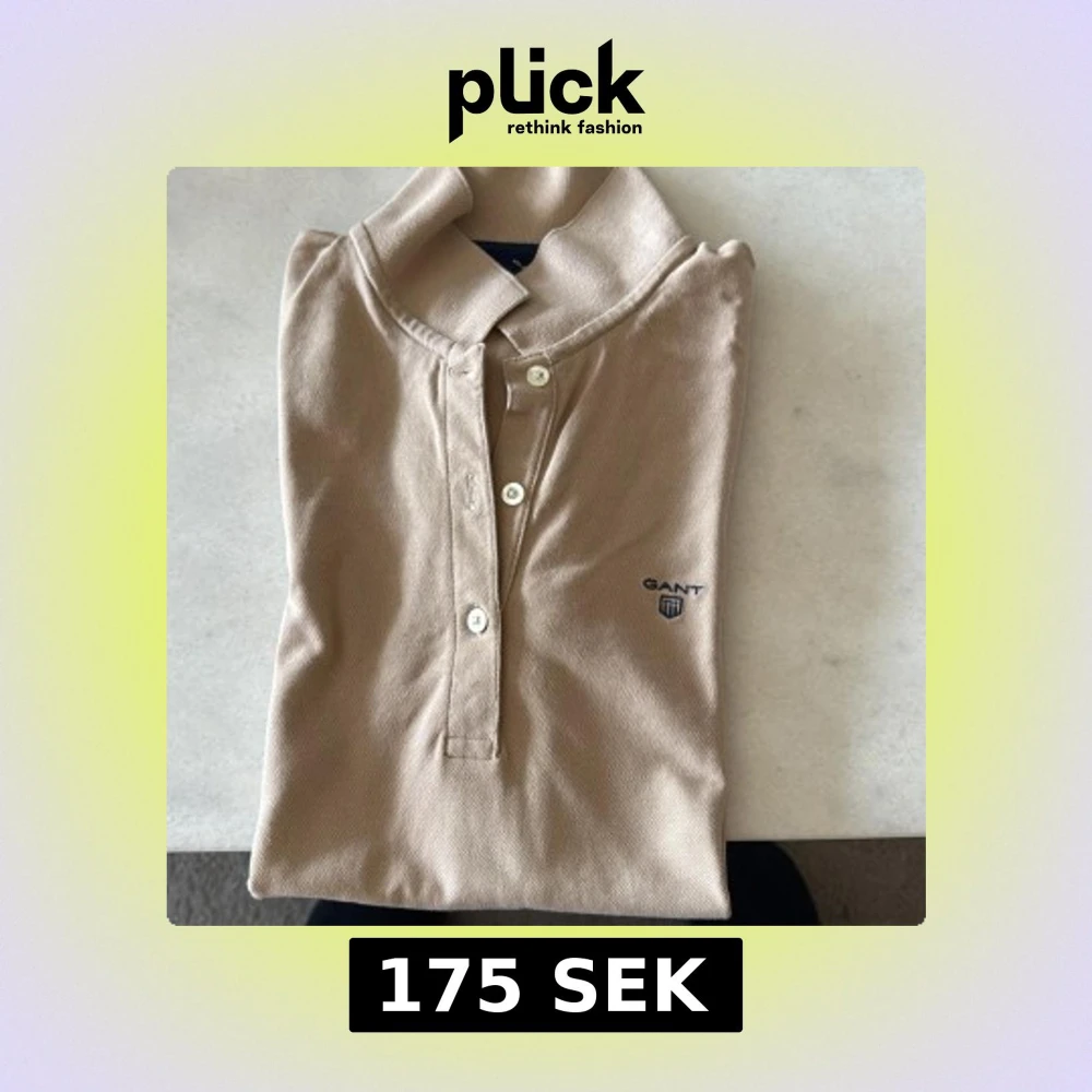 Säljer en klassisk beige pikétröja från GANT med krage och knäppning framtill. Tröjan har diskret GANT-logga broderad på bröstet och är perfekt för en stilren look.