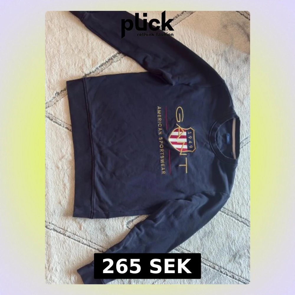 Snygg mörkblå sweatshirt från GANT med broderad logga och emblem i guld, rött och vitt. Tröjan har rund hals, ribbade muddar och lång ärm. Perfekt för dig som gillar klassisk amerikansk sportstil. str M/38