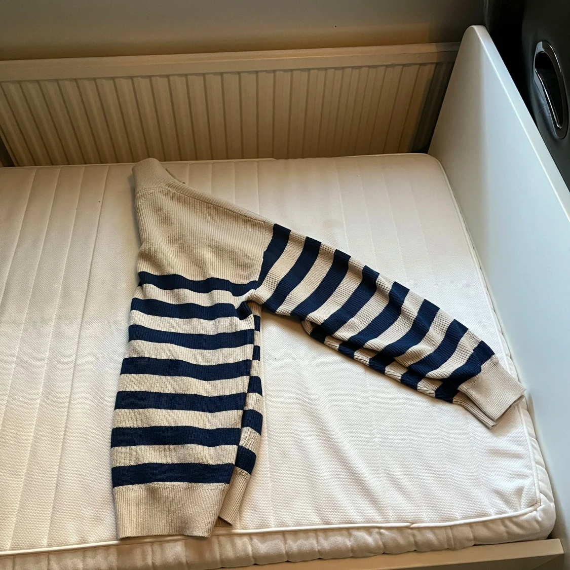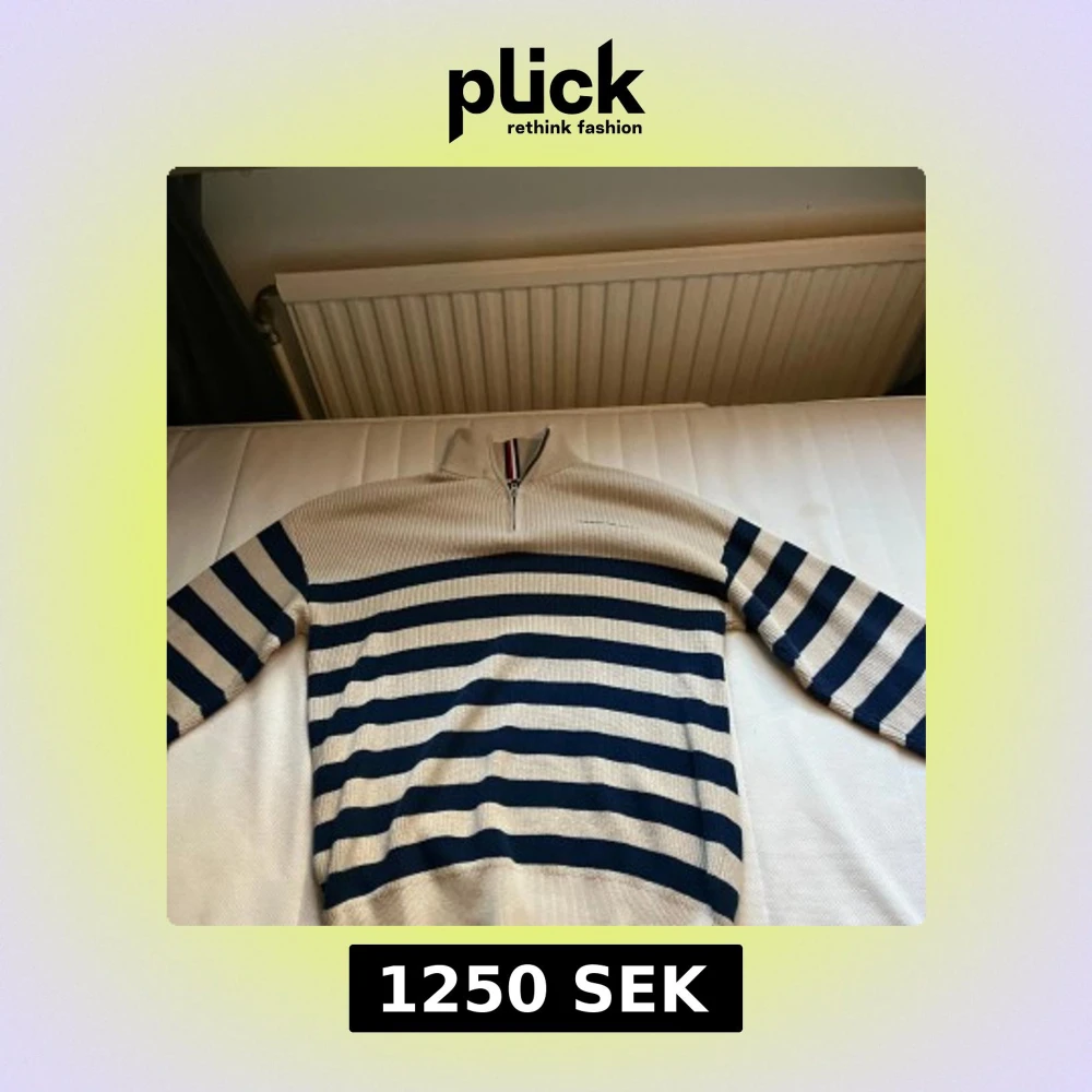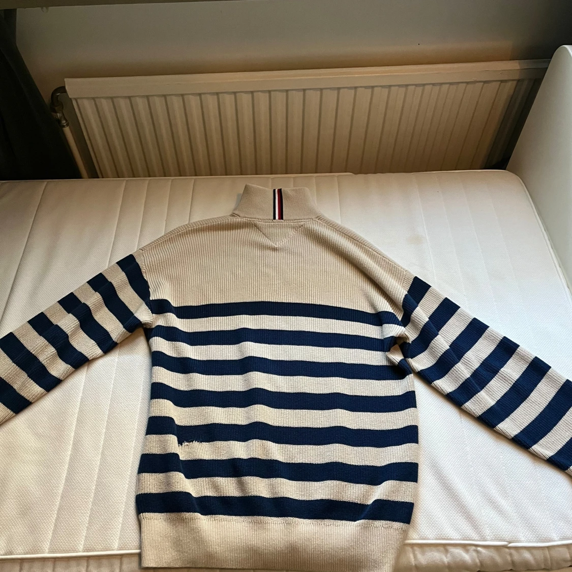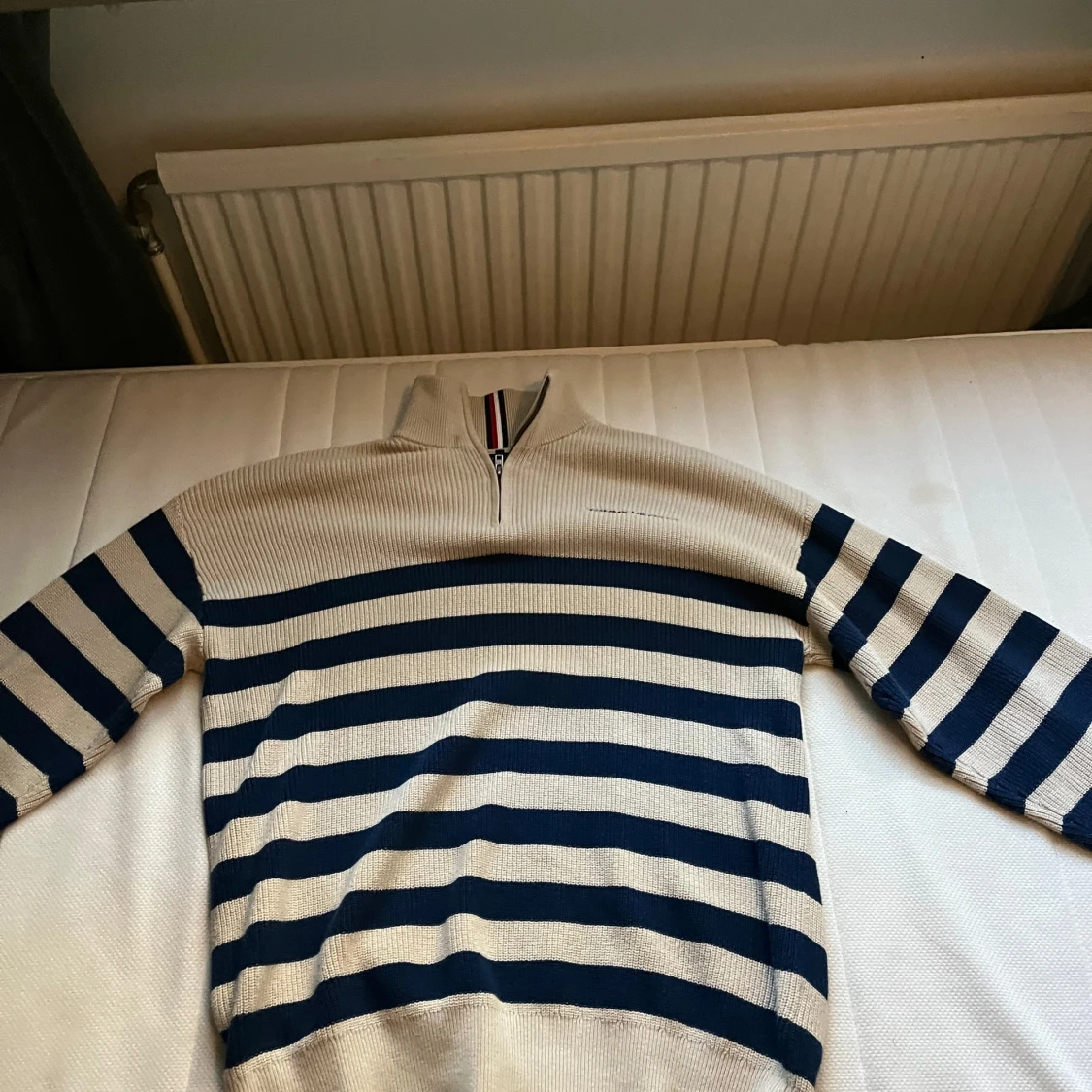 Beige och marinblå randig stickad tröja från Gant med half zip och hög krage. Tröjan har långa ärmar och ribbade muddar. Klassisk och stilren design med Gant-logga broderad på bröstet. Perfekt för lager-på-lager under kyliga dagar.