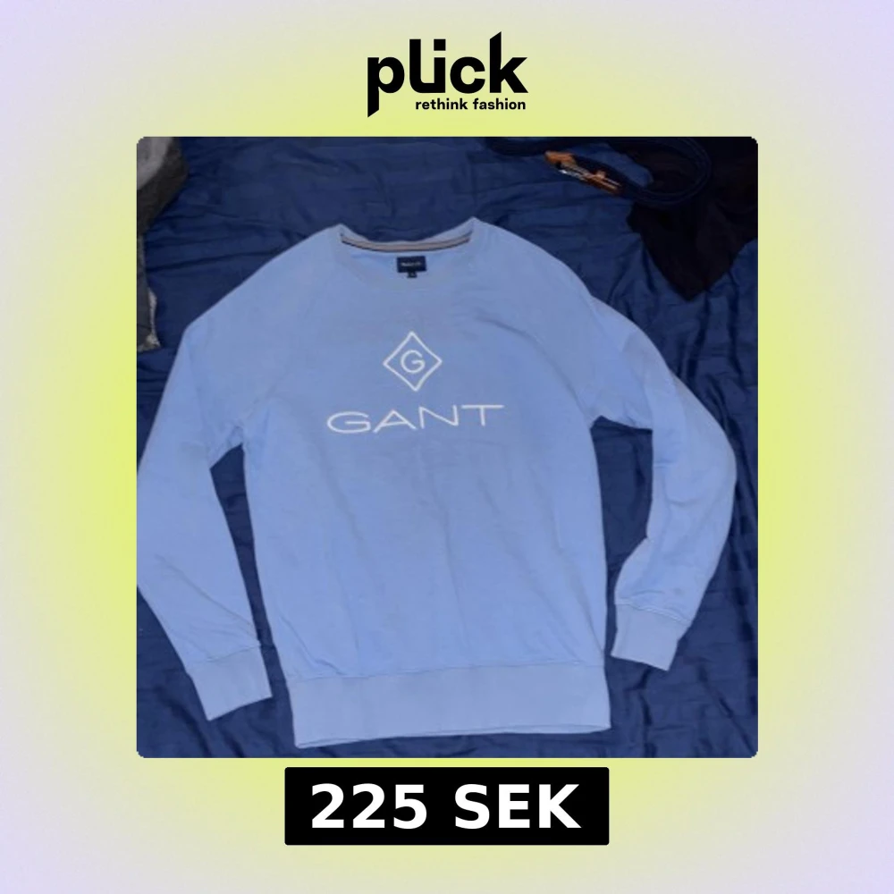 Snygg ljusblå sweatshirt från GANT i storlek M. Tröjan har ett stort vitt GANT-tryck och logga på bröstet, rund hals och ribbade muddar vid ärmar och nederkant. Tillverkad i mjuk bomull, perfekt för chill dagar och enkel att matcha med jeans.