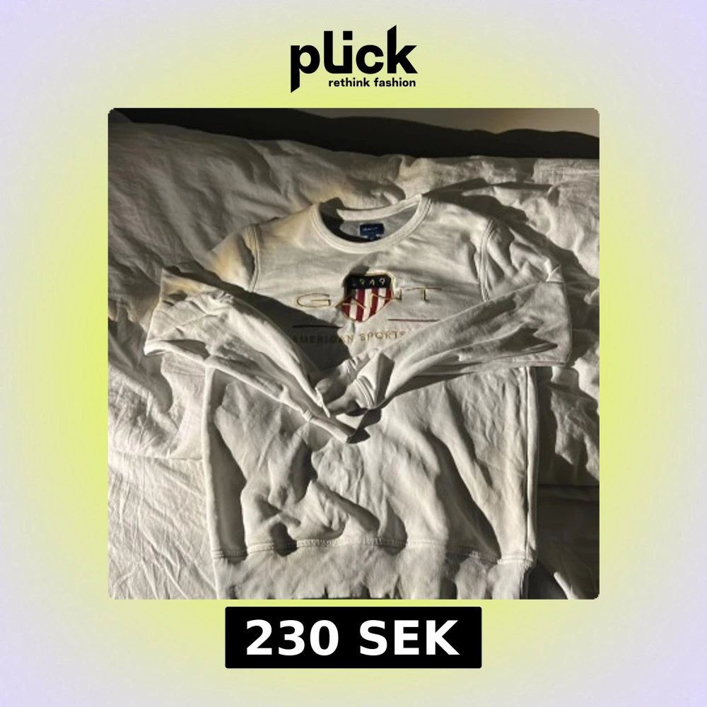 Säljer en vit sweatshirt från GANT med ett broderat emblem och texten 'American Sportswear' på framsidan. Tröjan har långa ärmar och ribbade muddar vid ärmslut och nederkant. Perfekt för en avslappnad stil. Den har en liten fläck vid ärmslut. Pris kan diskuteras.