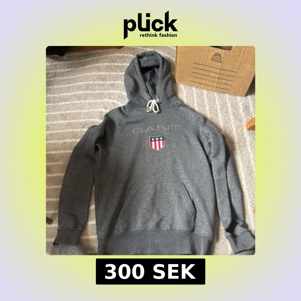 Snygg grå hoodie från GANT med broderad logga och sköld på bröstet. Tröjan har huva med vit snörning och en stor magficka. Nypris: 1200