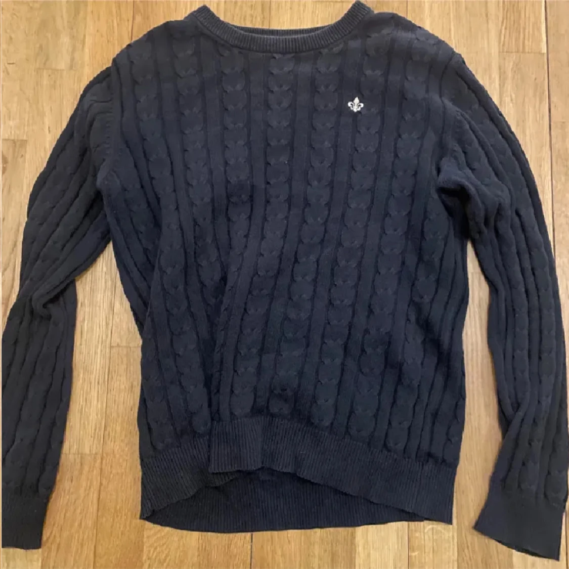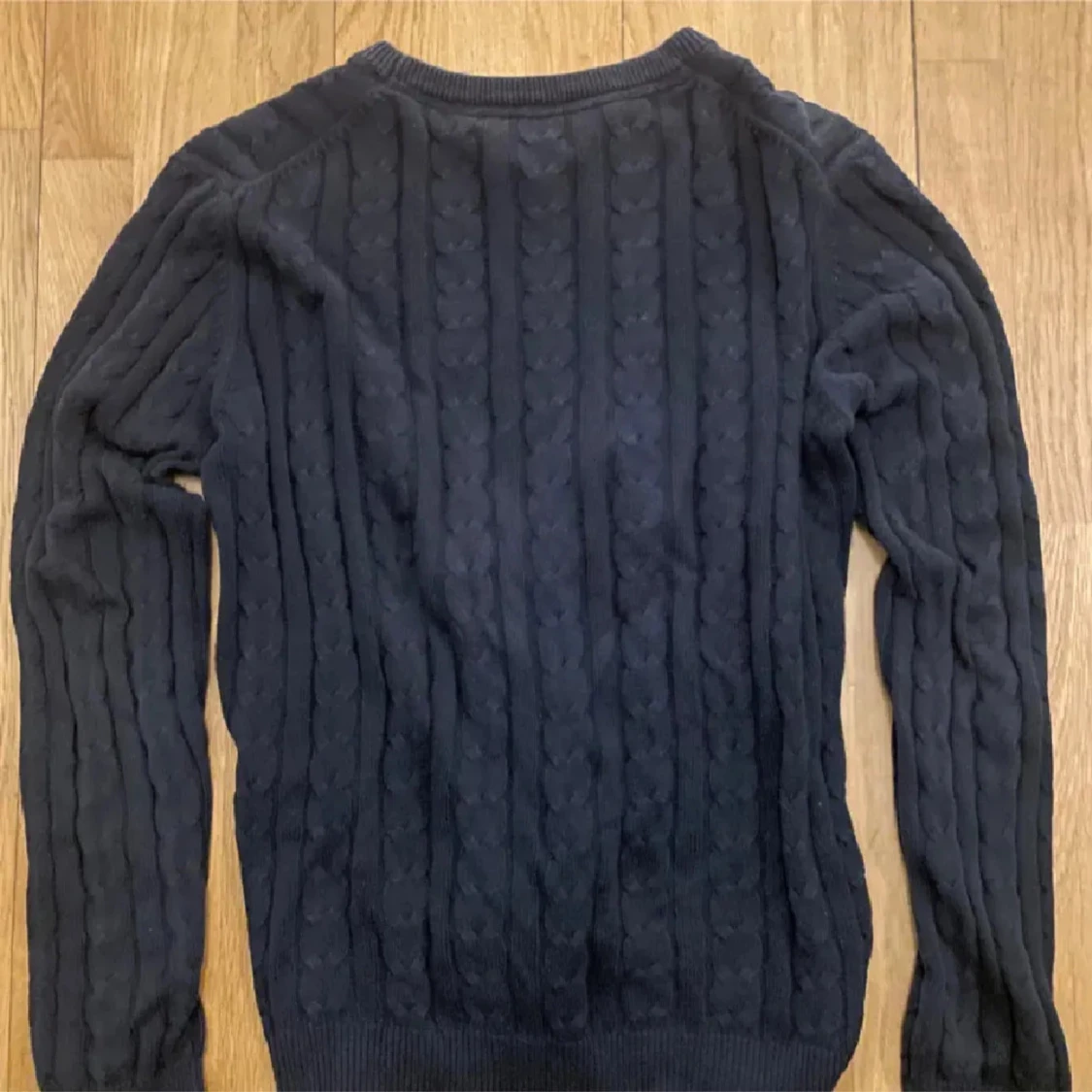 Snygg mörkblå stickad tröja från Gant med klassiskt kabelstickat mönster och ett litet silverfärgat emblem på bröstet. Tröjan har rund hals och långa ärmar, perfekt för dig som gillar stilren och tidlös design.