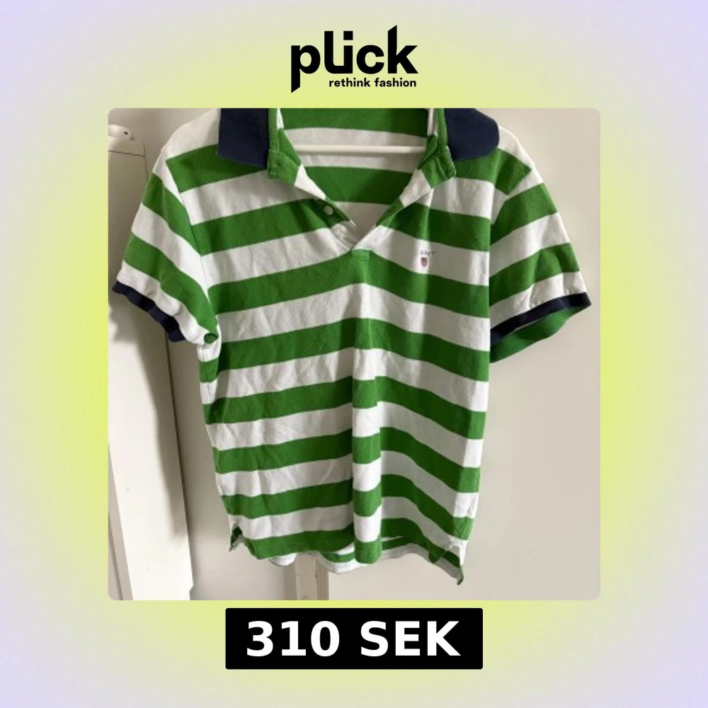Säljer en snygg grön och vit randig pikétröja från GANT. Tröjan har en klassisk krage i mörkblått och korta ärmar med mörkblå detaljer. Perfekt för en avslappnad stil. Lite nopprig på vissa ställen och saknas tvättlapp annars bra skick