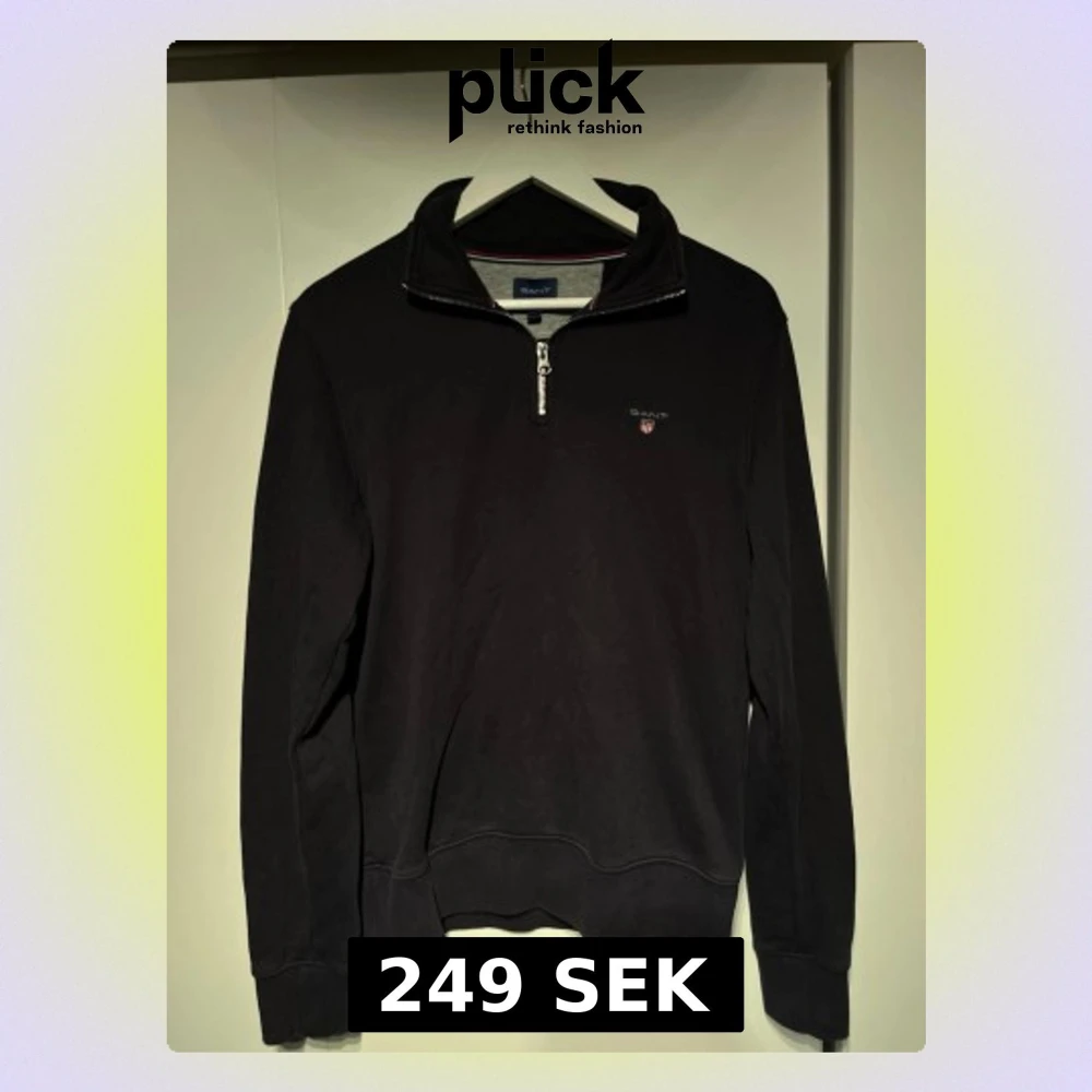 Mörkblå gant zip, i storlek M. Den är i använt skick men fortfarnade riktigt stilig. Modellrn är 177cm och passar den fint🤩
