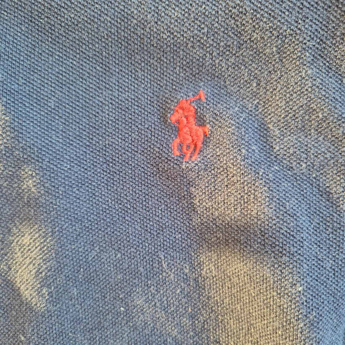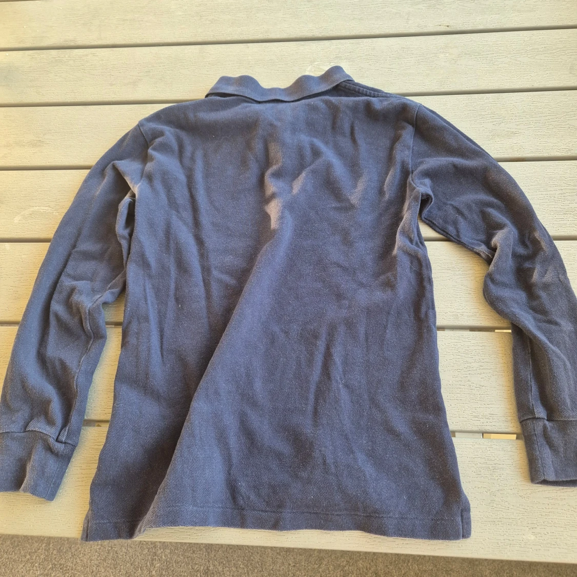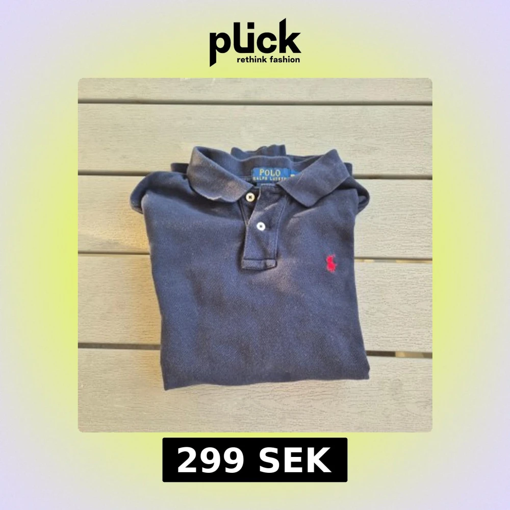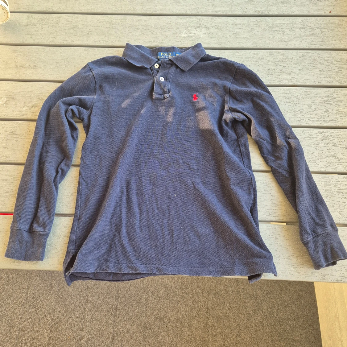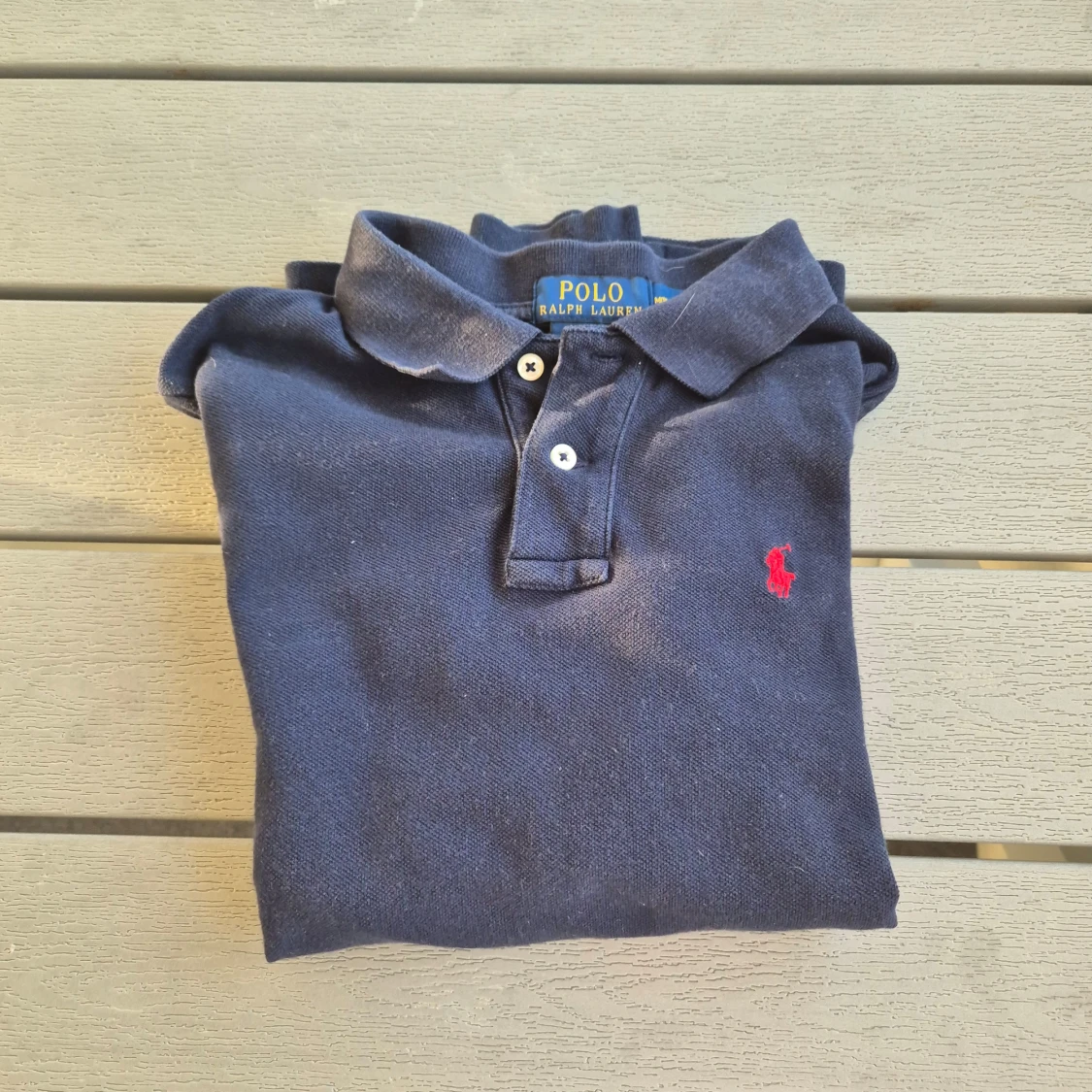 Säljer en klassisk blå pikétröja från Ralph Lauren med lång ärm och röd broderad logga på bröstet. Tröjan har en krage med knappar och är perfekt för en stilren look. Passar både till vardags och mer uppklädda tillfällen.
