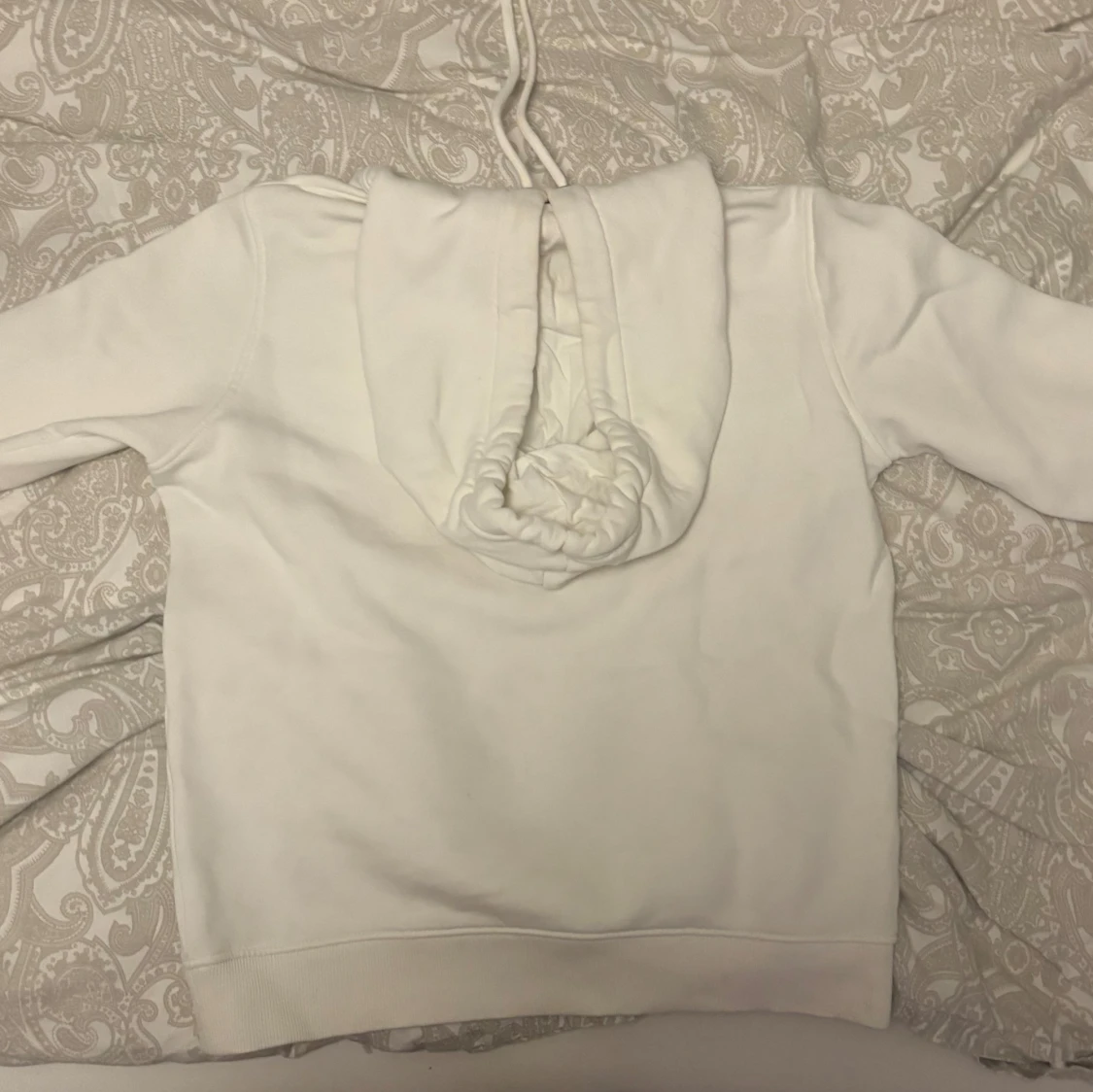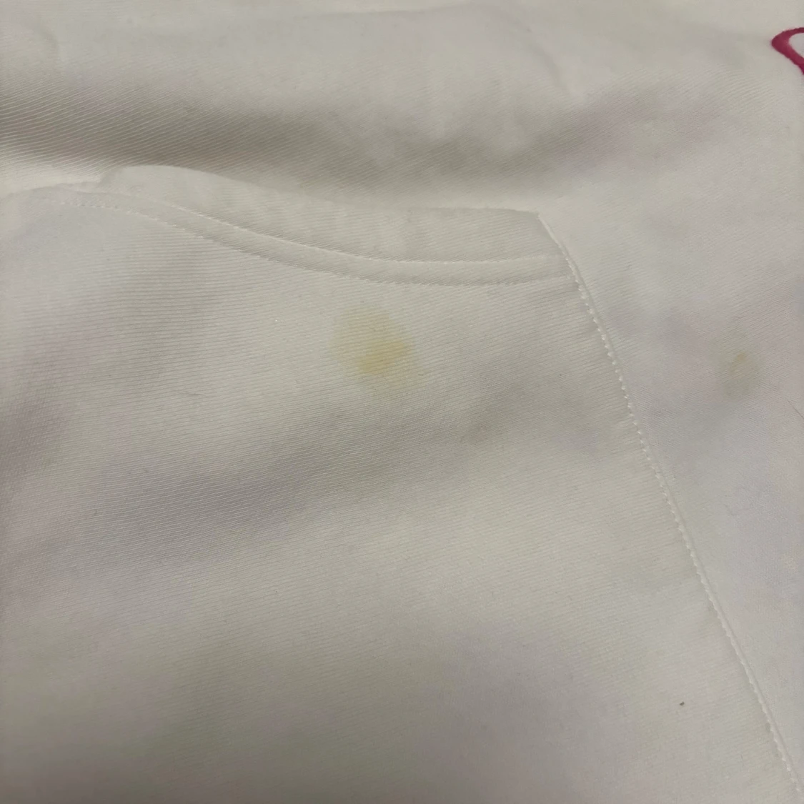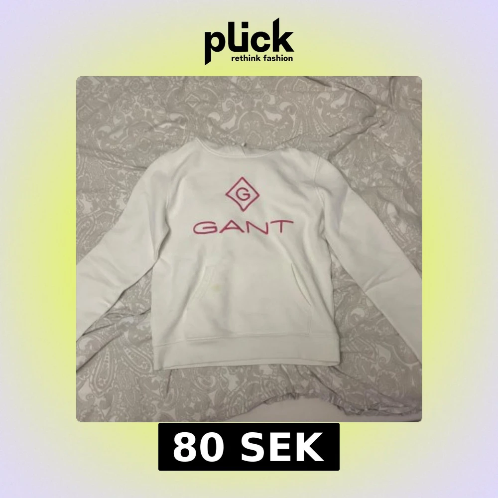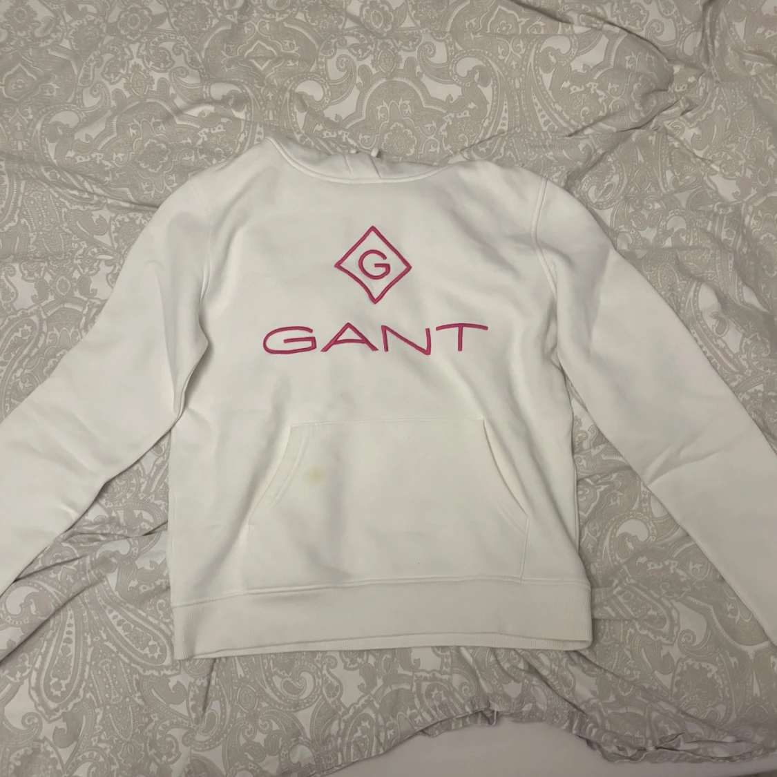 Vit hoodie från GANT med rosa logga och tryck på bröstet. Tröjan har huva med snörning, magficka och långa ärmar. Mjuk och skön bomullskvalitet, perfekt för chill dagar. Snyggt kontrasttryck i rosa som ger en fräsch vibe. Jätteskönt material, speciellt inuti. Tröjan har en fläck på fickan, men det syns knappt och tror det går att få bort den om man försöker. Men pågrund av fläcken så är priset lägre.