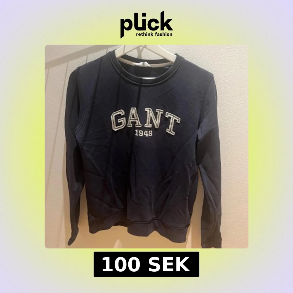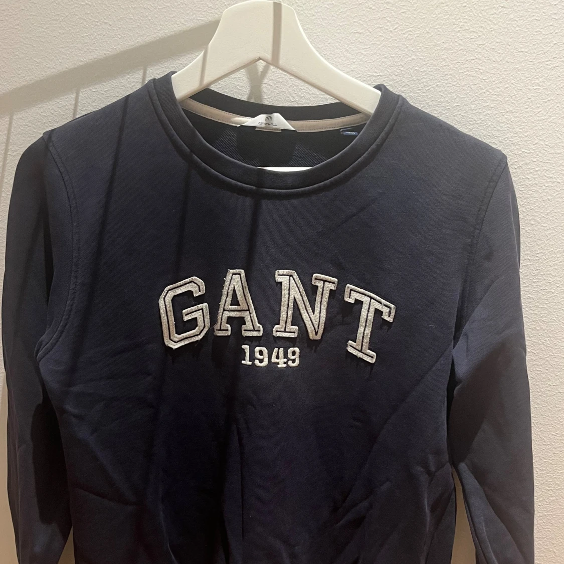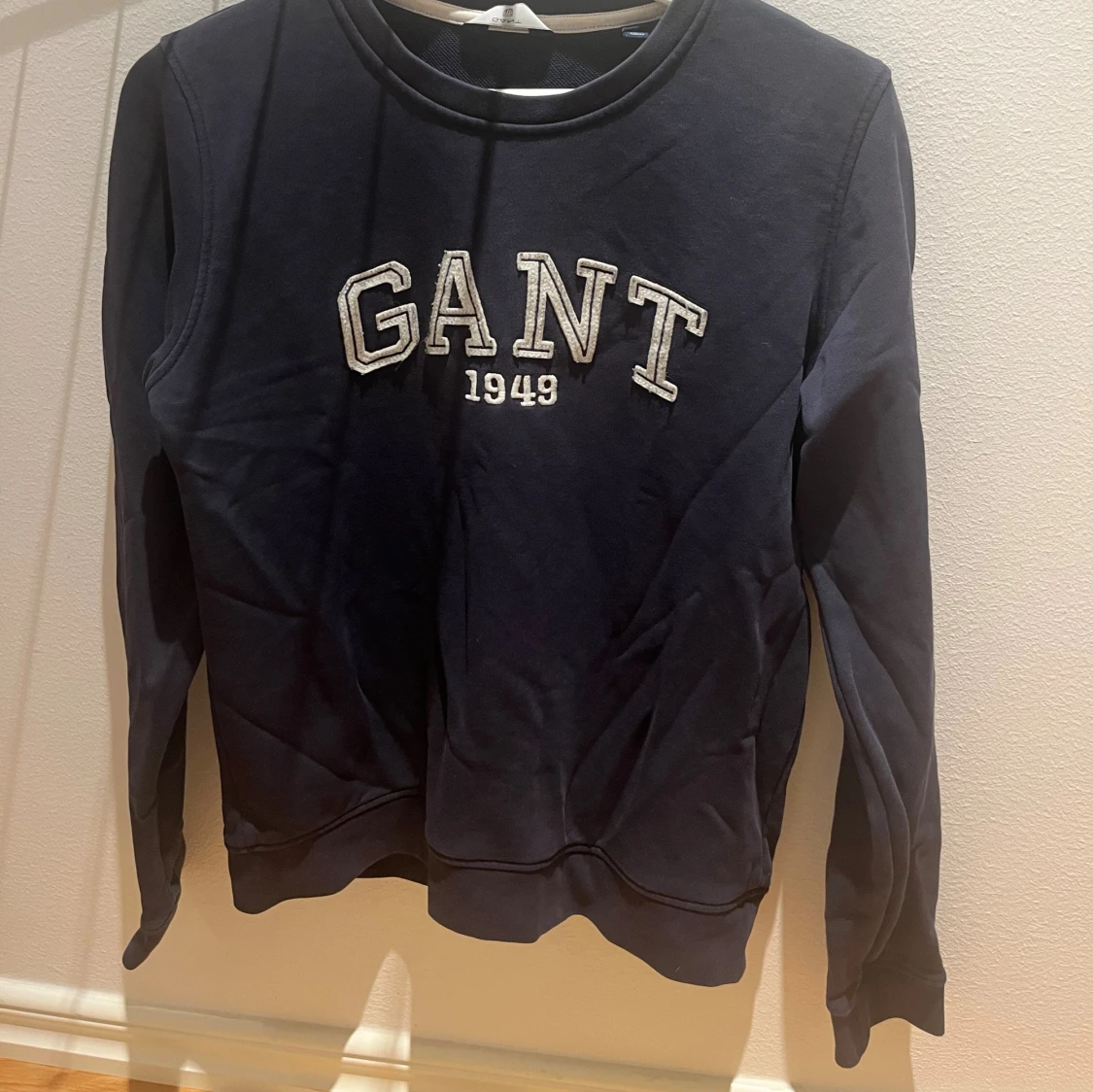 Säljer en mörkblå sweatshirt från GANT med broderad logga och årtal 1949 på bröstet. Tröjan har rund halsringning och långa ärmar. Perfekt för dig som gillar klassisk och sportig stil.