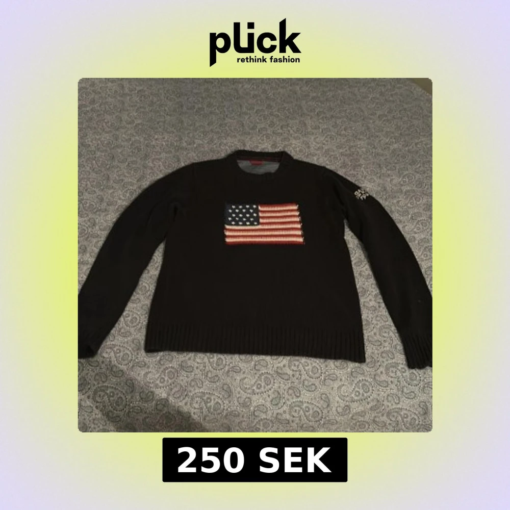 Mörkblå stickad tröja från Gant med amerikansk flagga broderad på bröstet och texten 'GANT NEW HAVEN 1949' på ena ärmen. Klassisk rund halsringning och ribbade muddar vid ärmslut och nederkant. Den har en slitning på höger arm men annars är den i bra skick!