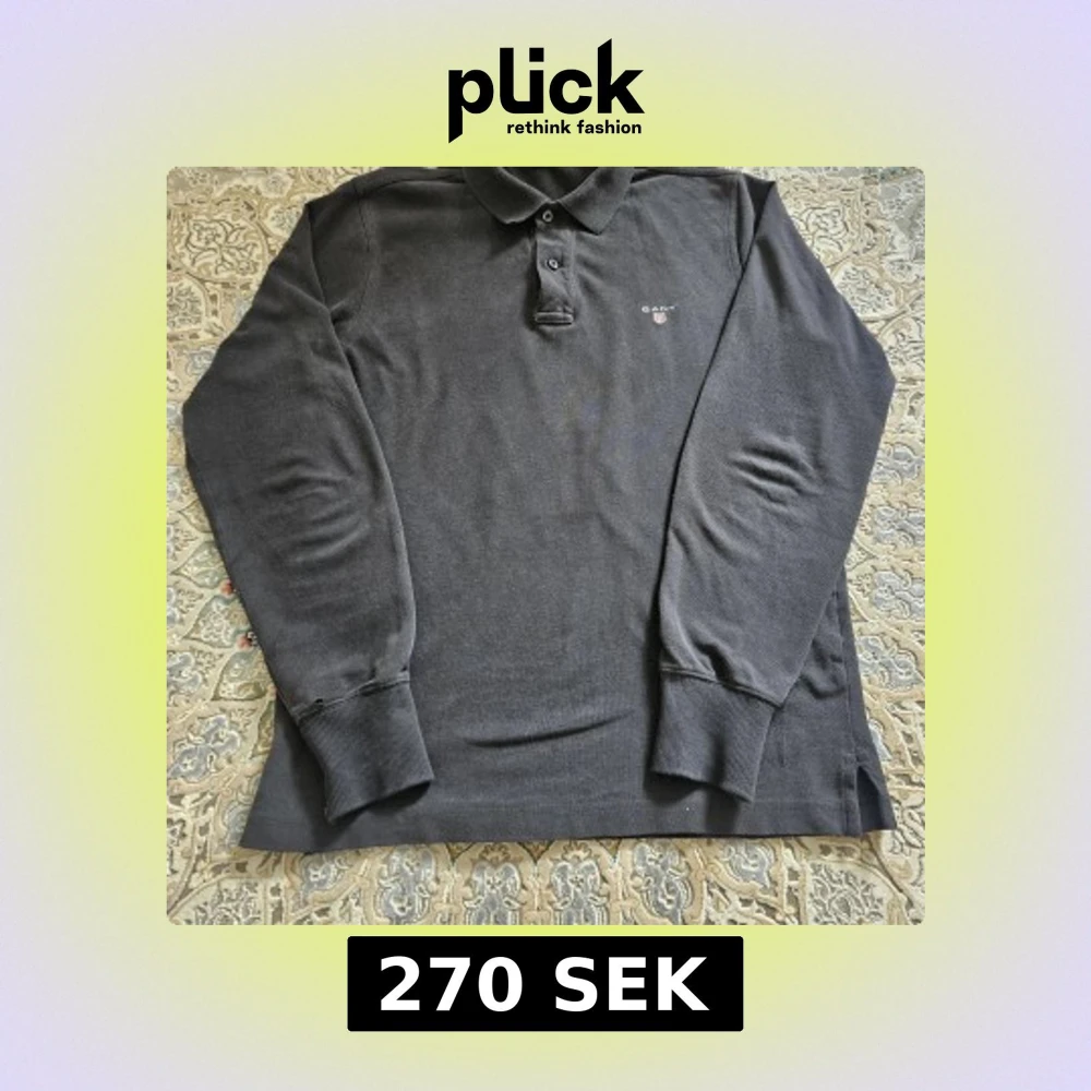 Klassisk svart långärmad pikétröja från Gant med broderad logga på bröstet. Tröjan har krage, knappar framtill och ribbade muddar vid ärmsluten. Ett litet hål som man kan se på bilden, men som knappast syns eller märks.