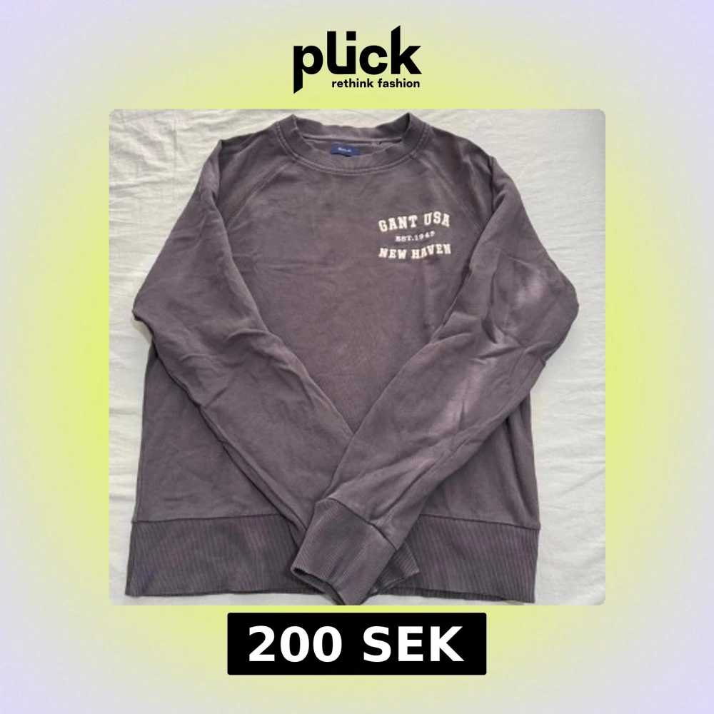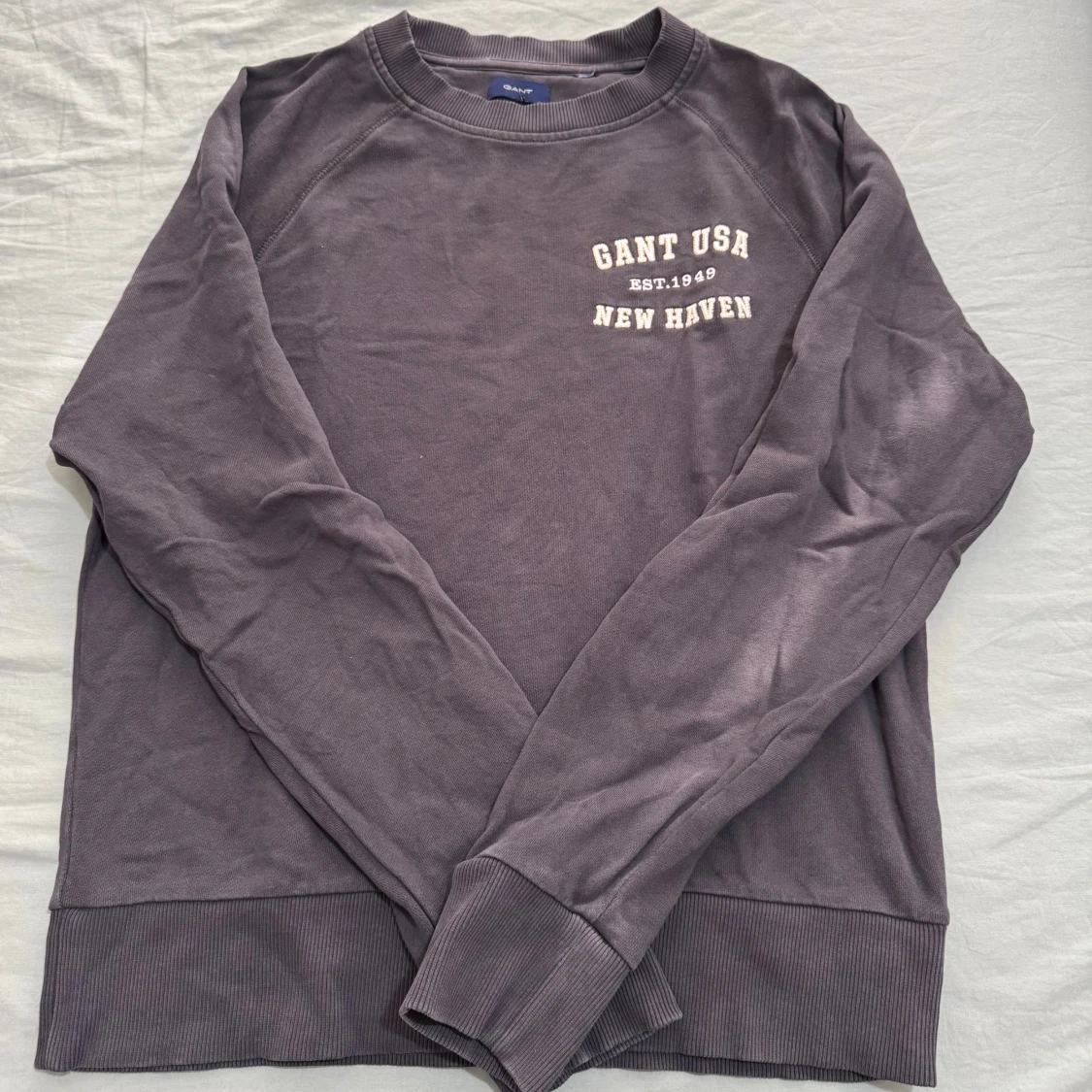 Säljer en lila sweatshirt från Gant med tryck 'GANT USA EST. 1949 NEW HAVEN' på bröstet. Tröjan har rund halsringning, långa ärmar och ribbade muddar vid ärmslut och nederkant. Perfekt för en chill och avslappnad stil.
