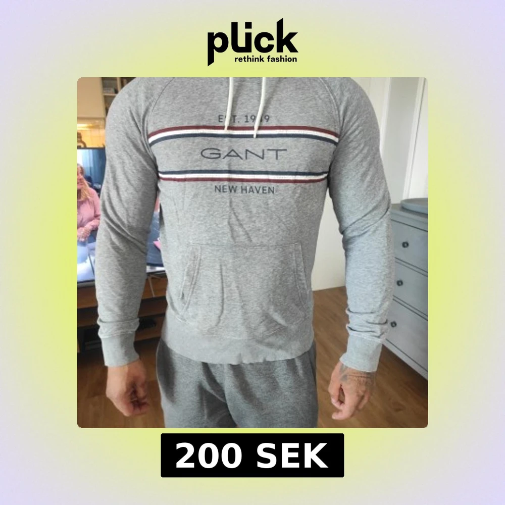 Säljer en stilren grå hoodie från GANT med texten 'NEW HAVEN' och 'EST. 1949' tryckt på bröstet. Tröjan har en känguruficka och justerbar huva med snören. Perfekt för en avslappnad look.