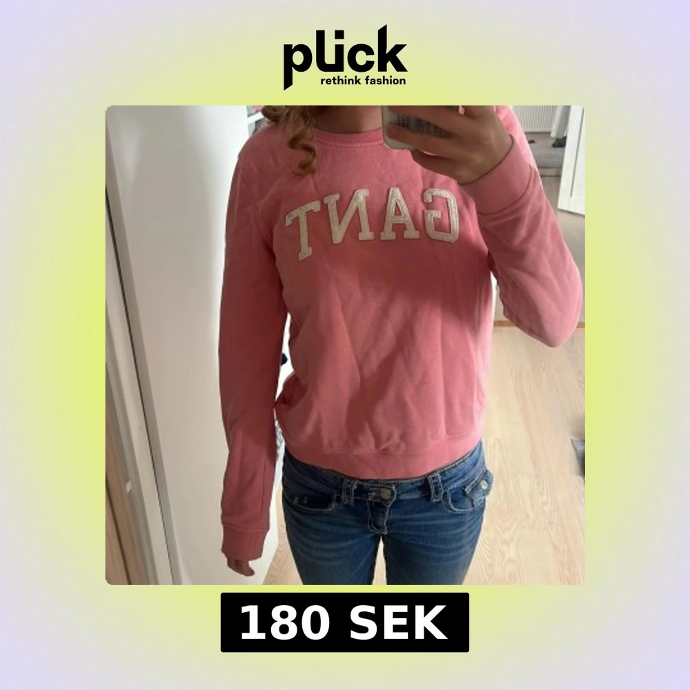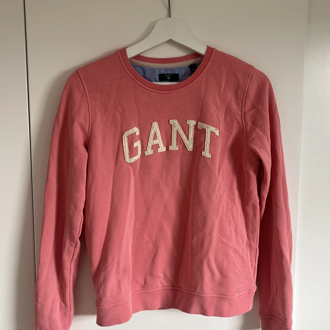 Säljer en rosa sweatshirt från GANT med broderad logga i vitt framtill. Tröjan har rund halsringning och långa ärmar. Storlek S/xs