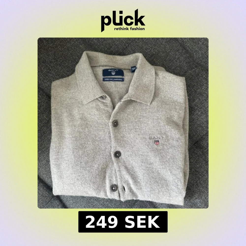 Grå kofta från Gant i superfin lammull. Klassisk design med krage, knappar hela vägen och broderad logga på bröstet. Perfekt för lager-på-lager och funkar året om. Tröjan är i bra skick men har ett litet hål på armen plus några hål på ryggen. Inget man lägger jätte stor bemärkelse till.