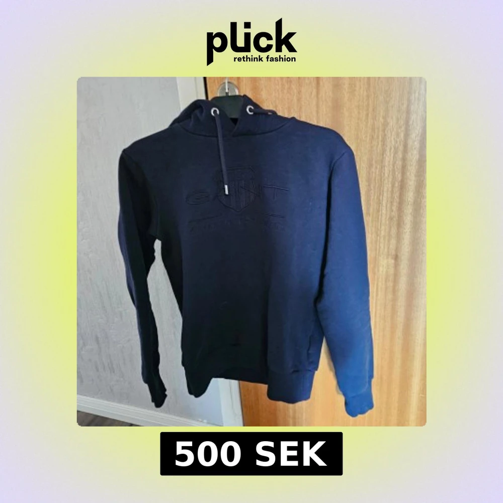 Säljer en stilren mörkblå hoodie från GANT med broderad logga på bröstet. Tröjan har en klassisk huva med dragsko och ribbade muddar vid ärmslut och nederkant. Perfekt för en avslappnad stil. Svårt att fånga rätt färg på bild. Den är i värdigt i ny skick