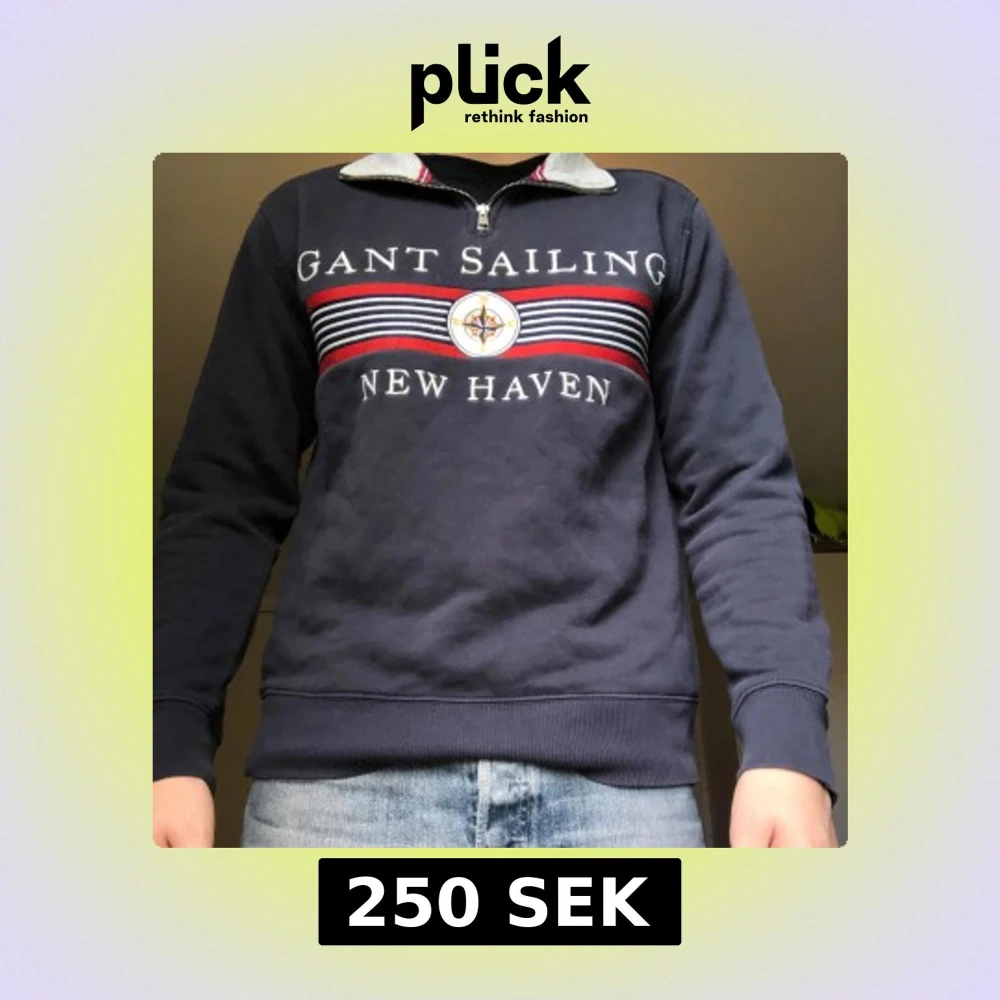 Säljer en marinblå halvzip tröja från Gant med broderad text 'Gant Sailing New Haven' och ett kompassmärke framtill. Tröjan har långa ärmar, ribbade muddar och röd/vit randig detalj över bröstet. Perfekt för en sportig och stilren look.