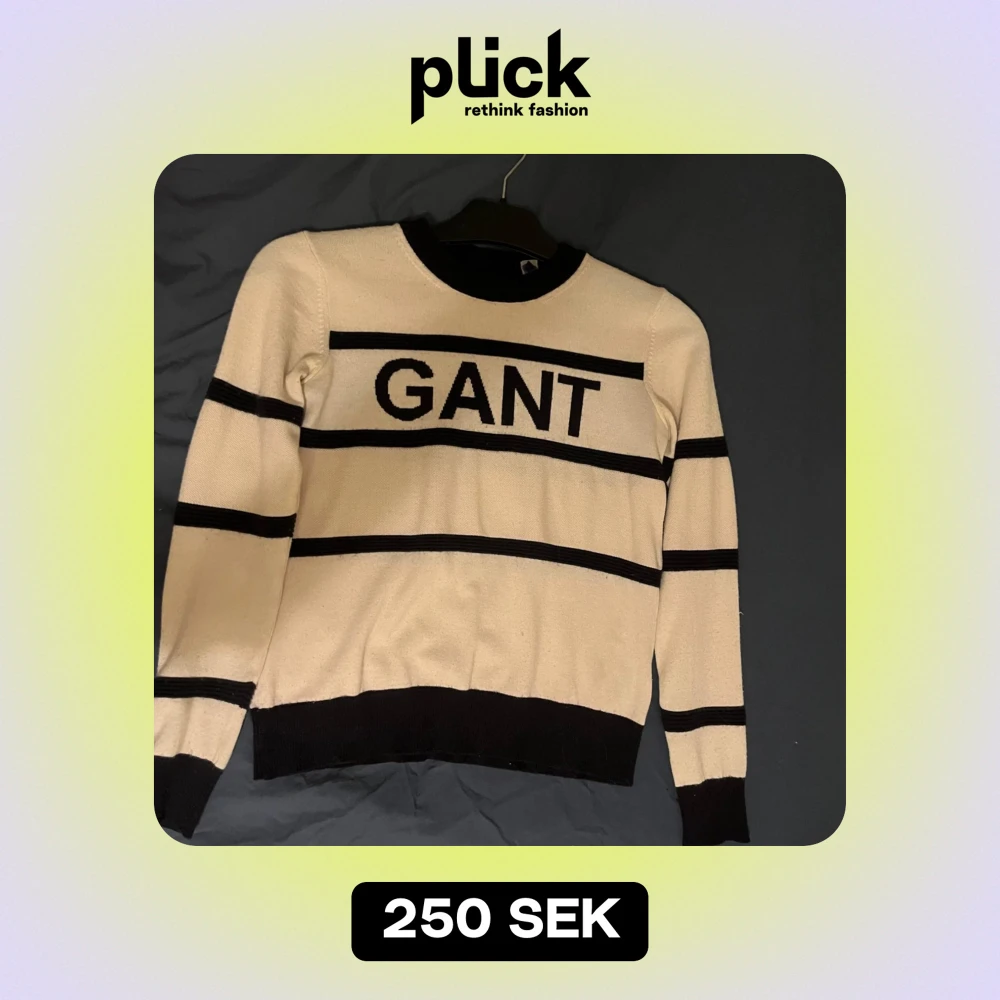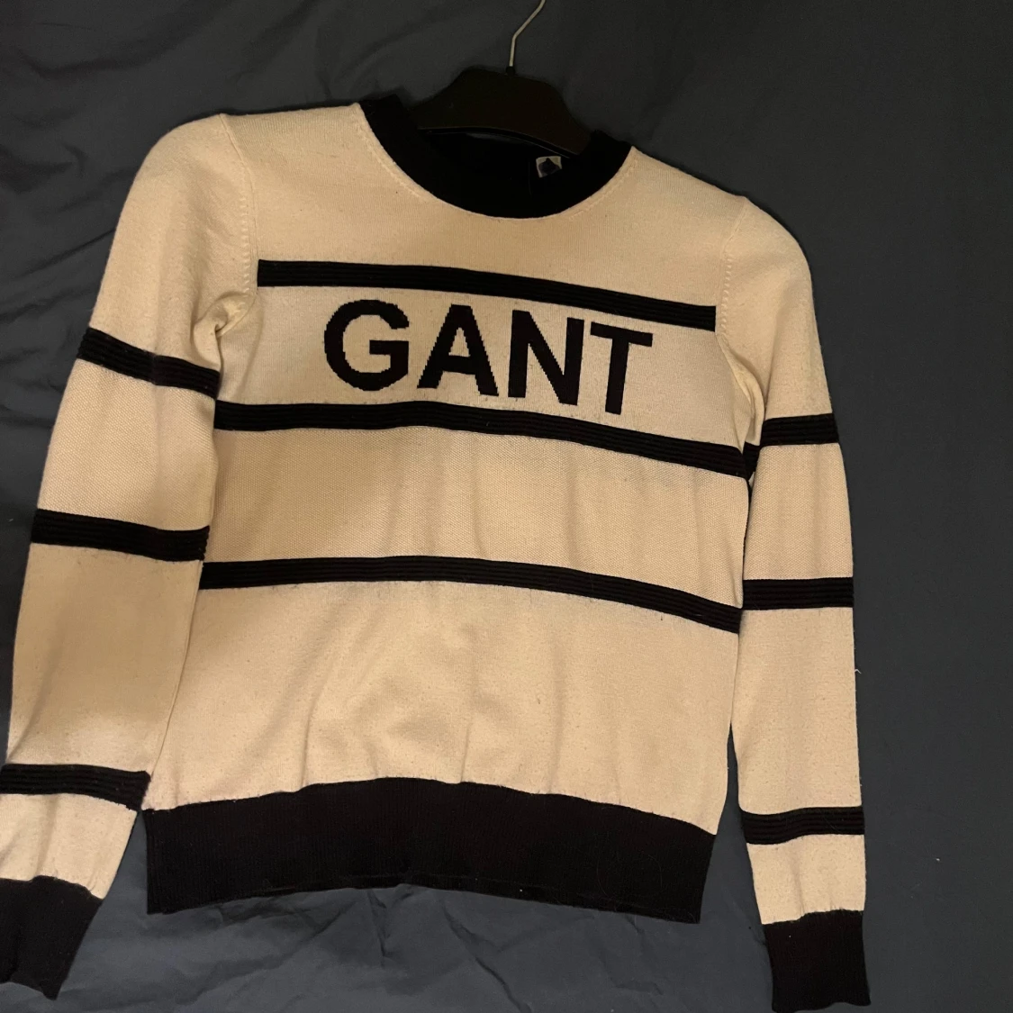 Säljer en snygg vit tröja från GANT med svarta ränder och logga. Tröjan har långa ärmar och är perfekt för både vardag och fest. Den är i mycket bra skick och passar perfekt till höst och vår.