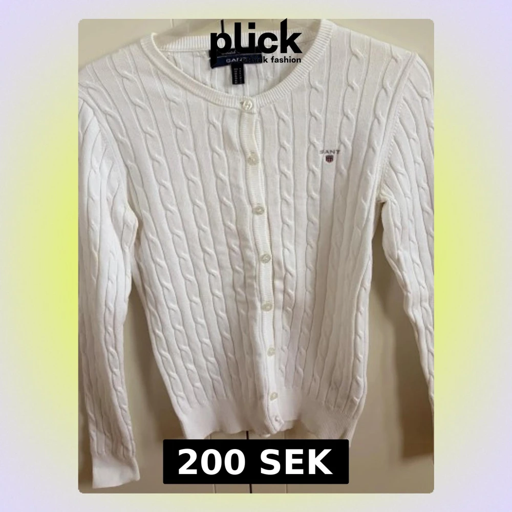 Kabelstickad vit kofta från Gant i stretchig bomull. Klassisk rund halsringning, knäppning framtill med vita knappar och diskret Gant-logga broderad på bröstet. Perfekt för en clean och stilren look.