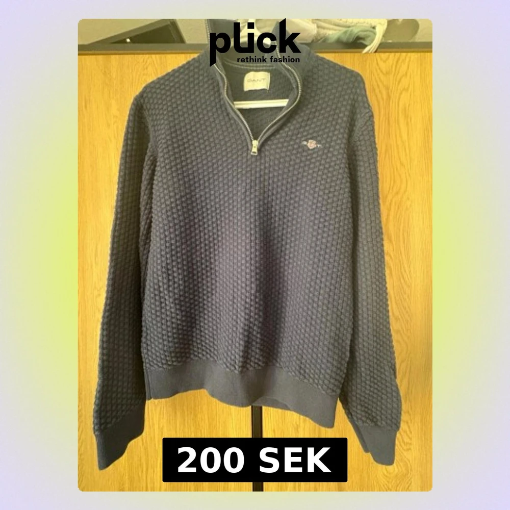 Säljer en marinblå stickad tröja från GANT med halvzip och ribbade muddar. Tröjan har ett diskret GANT-logo broderat på bröstet och ett snyggt strukturmönster i tyget. Perfekt för dig som gillar klassisk och stilren design.