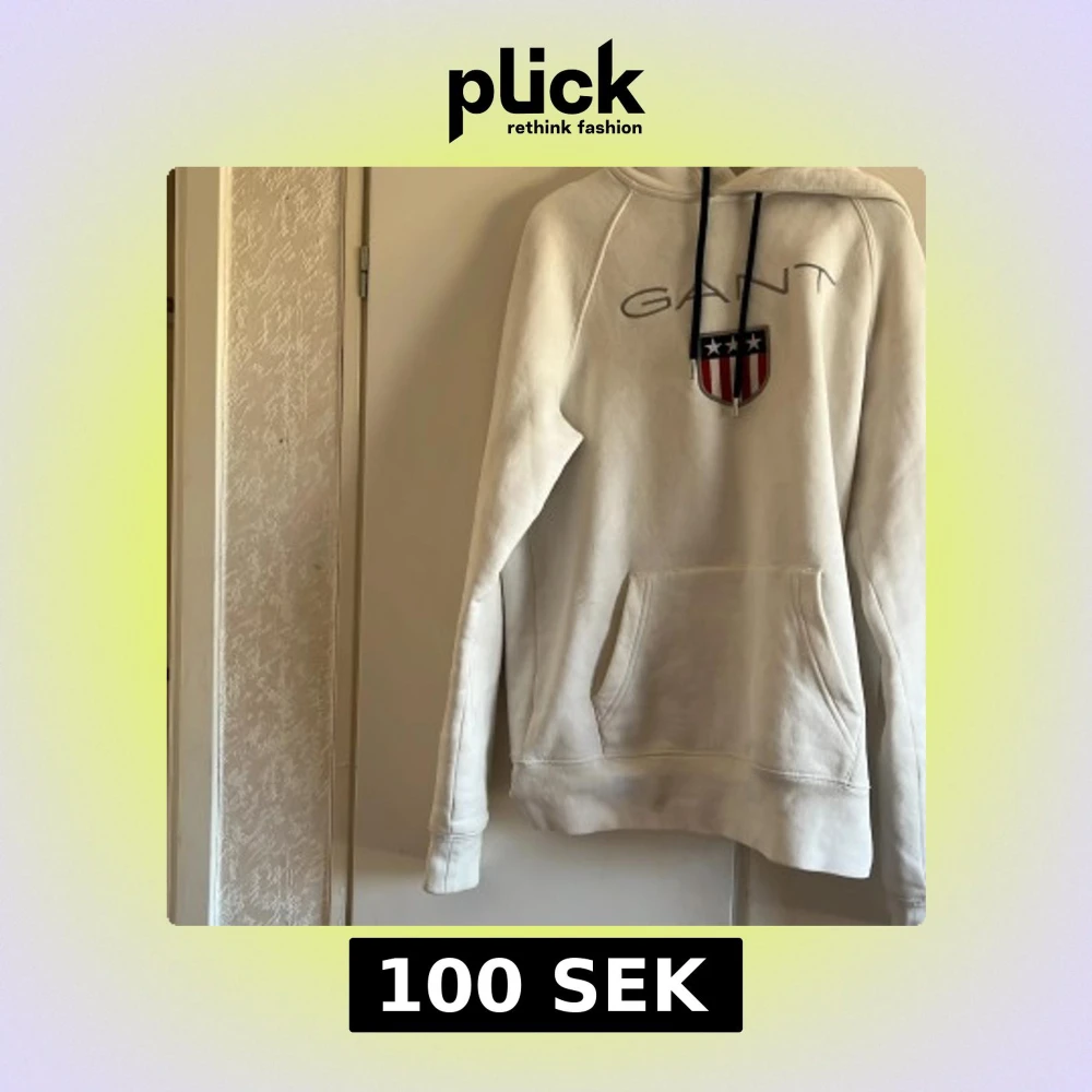 Vit hoodie från Gant med broderad logo och sköld på bröstet. Tröjan har huva med svarta snören, känguruficka och långa ärmar. Perfekt för en chill och sportig look. Använd 1-3 gånger max