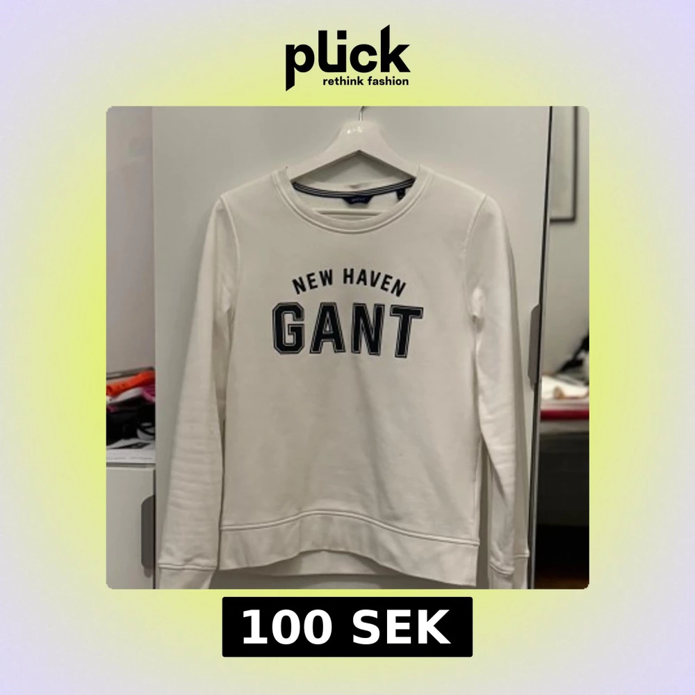 Säljer en stilren vit långärmad tröja från GANT med texten 'NEW HAVEN GANT' som är i storlek S. bra pris och bra kvalité bara 100 kr frågor bara att skriva🤙