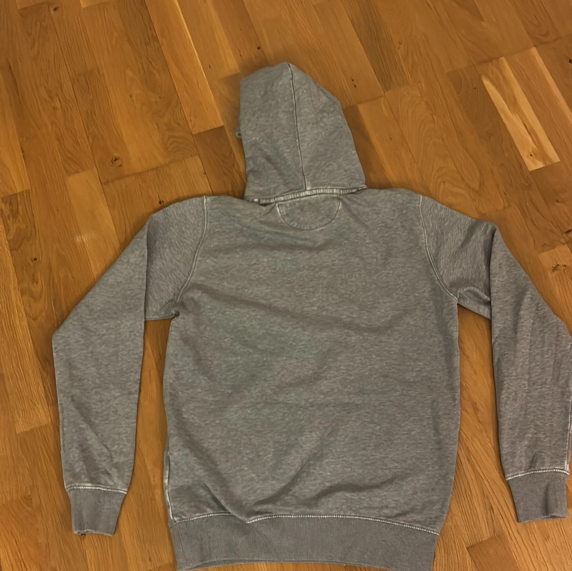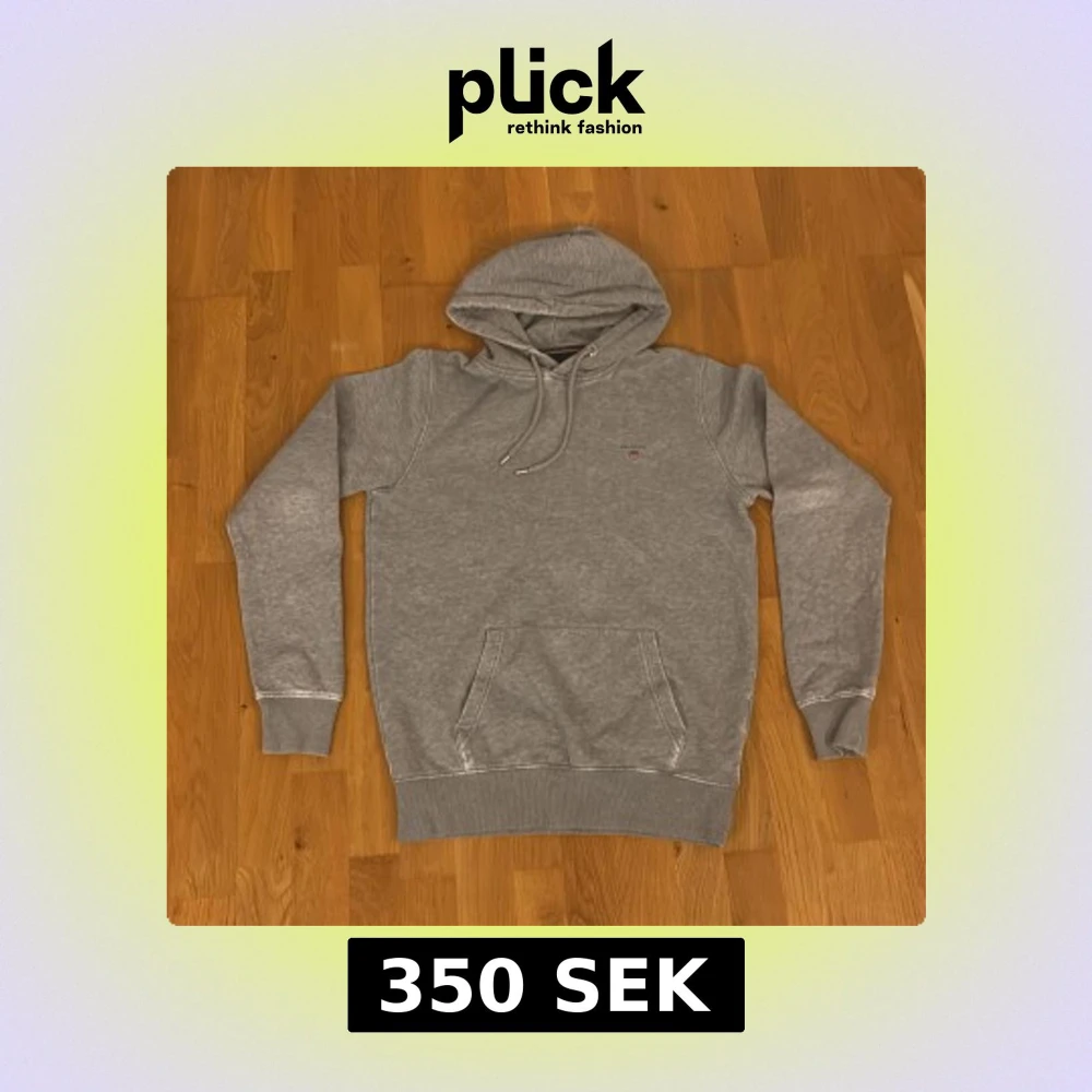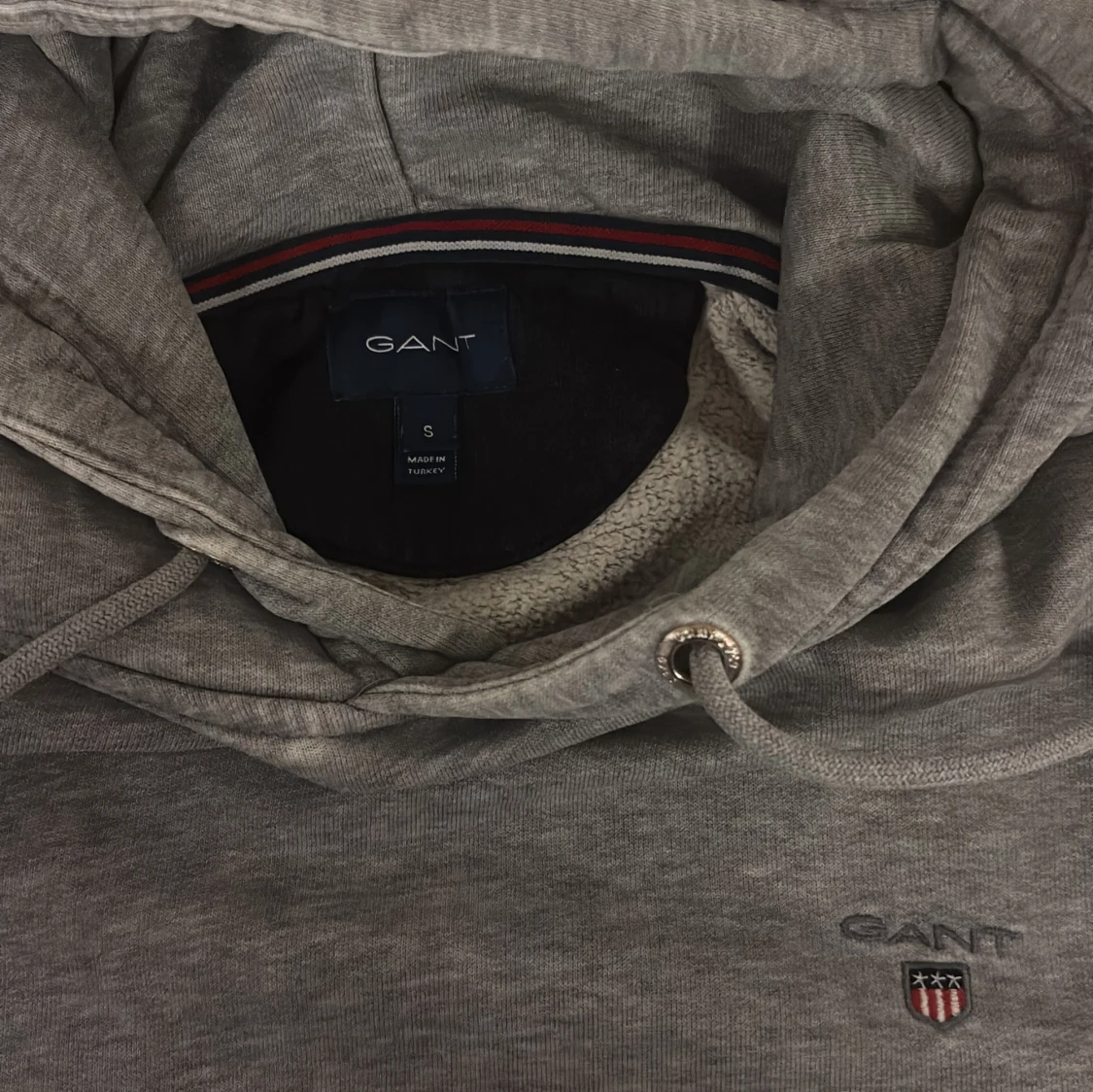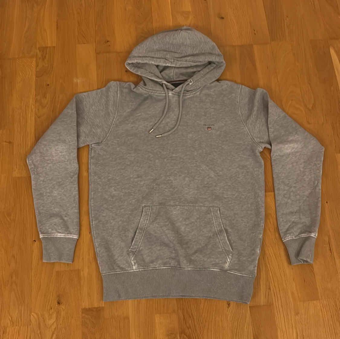 Grå hoodie från GANT med broderad logo på bröstet. Är S men passar XS. Klassisk känguruficka, snörning (lite slitna i endan) i huvan och ribbade muddar. Tillverkad i mjuk polyesterblandning, perfekt för chill dagar. Snygg och enkel stil som funkar året runt. Pris går diskutera🙌