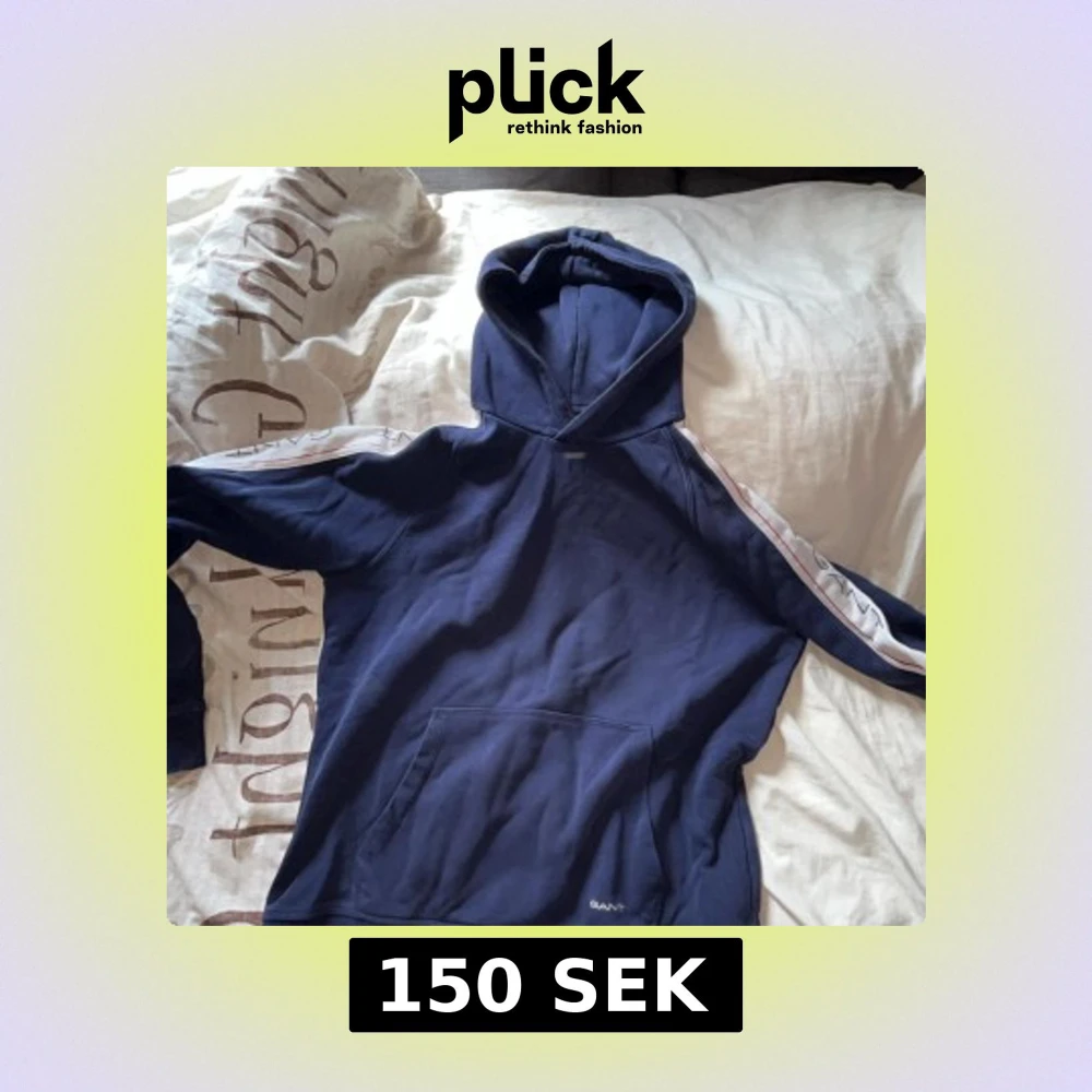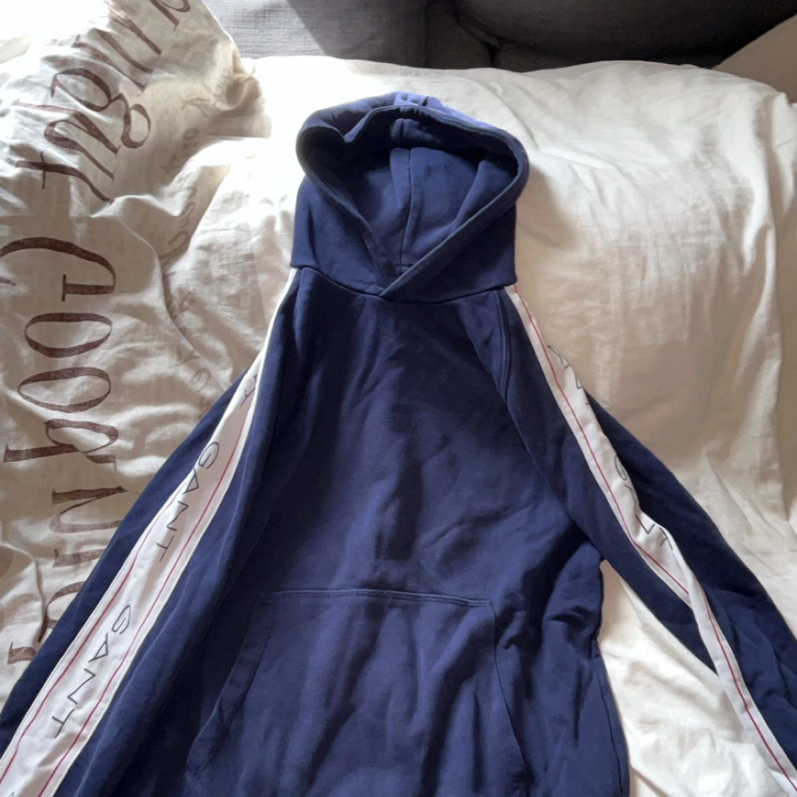 Säljer en snygg blå hoodie från GANT med vita och röda ränder längs ärmarna. Tröjan har en klassisk känguruficka och en bekväm huva. Perfekt för en avslappnad stil.