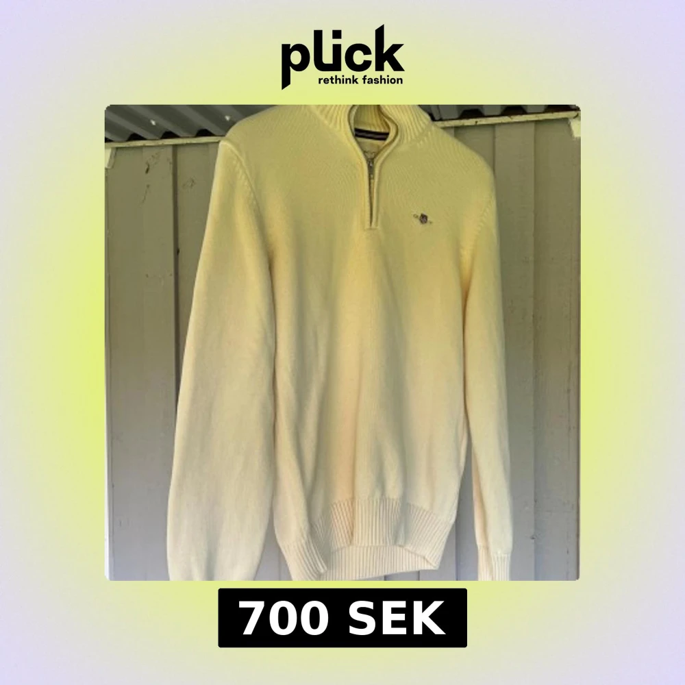 Säljer en ljusbeige stickad tröja från Gant med half zip och liten broderad logga på bröstet. Tröjan har hög krage, ribbade muddar och är långärmad. Perfekt för dig som gillar klassisk och clean stil.