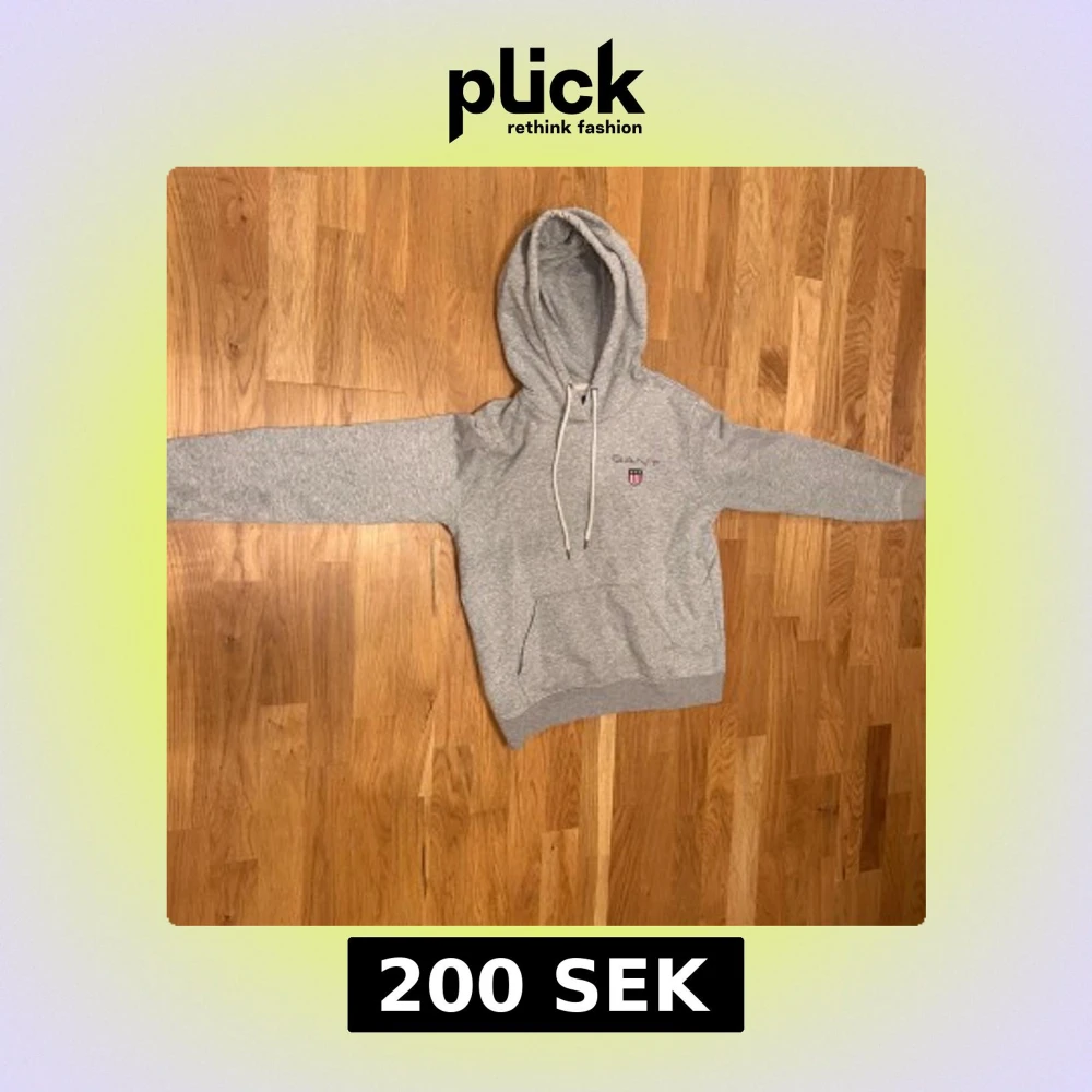 Säljer en stilren grå hoodie från GANT med broderad logga och sköld på bröstet. Tröjan har huva med snörning, magficka och långa ärmar. Perfekt för dig som gillar klassisk och avslappnad stil.