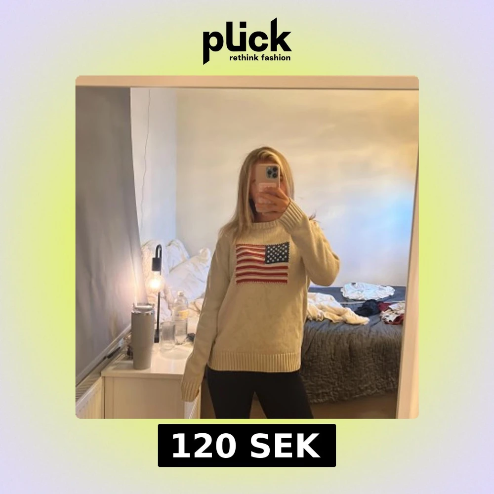 Säljer en beige stickad tröja från GANT i storlek small, tillverkad i 100% bomull. Tröjan har ett broderat amerikanskt flaggmotiv på bröstet och ribbade muddar vid ärmslut och nederkant. Perfekt för dig som gillar preppy stil och snygga detaljer.