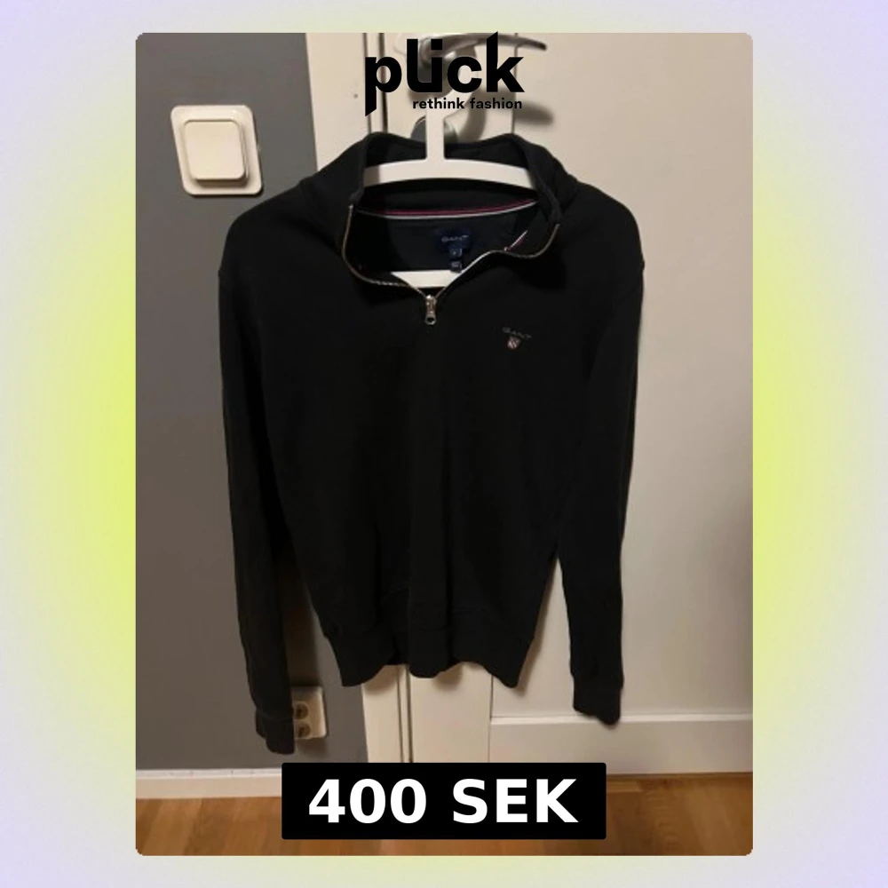 Svart hoodie från GANT med half zip-dragkedja och broderad logga på bröstet. Är i bra skick storlek S. Hör av dig vid minsta fundering!
