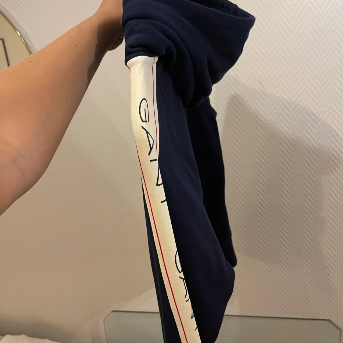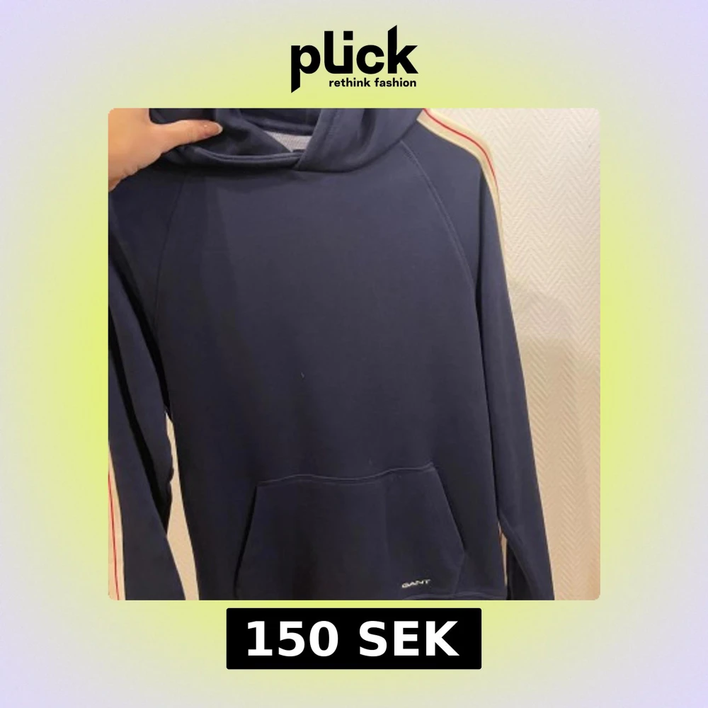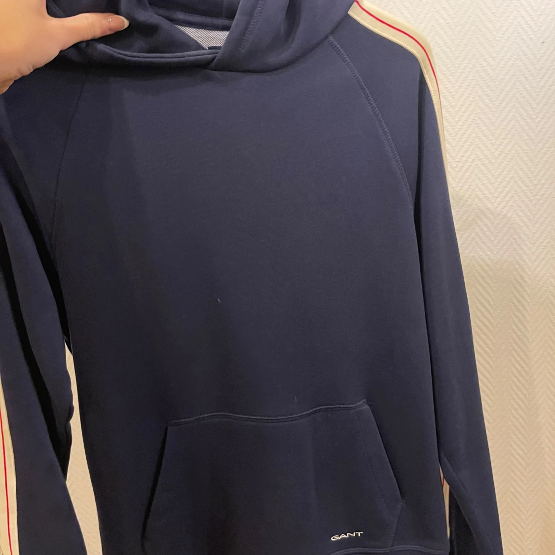 Säljer en snygg mörkblå hoodie från GANT med vita och röda ränder längs ärmarna. Tröjan har en klassisk känguruficka och en bekväm huva. Perfekt för en avslappnad stil.