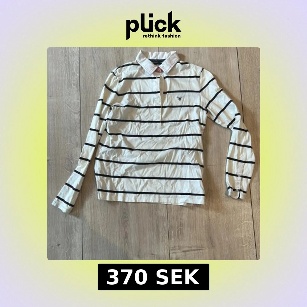 Vit långärmad pikétröja från GANT med marinblå horisontella ränder och klassisk krage. Tröjan har knappar framtill och broderad GANT-logga på bröstet. Perfekt för en stilren och sportig look.