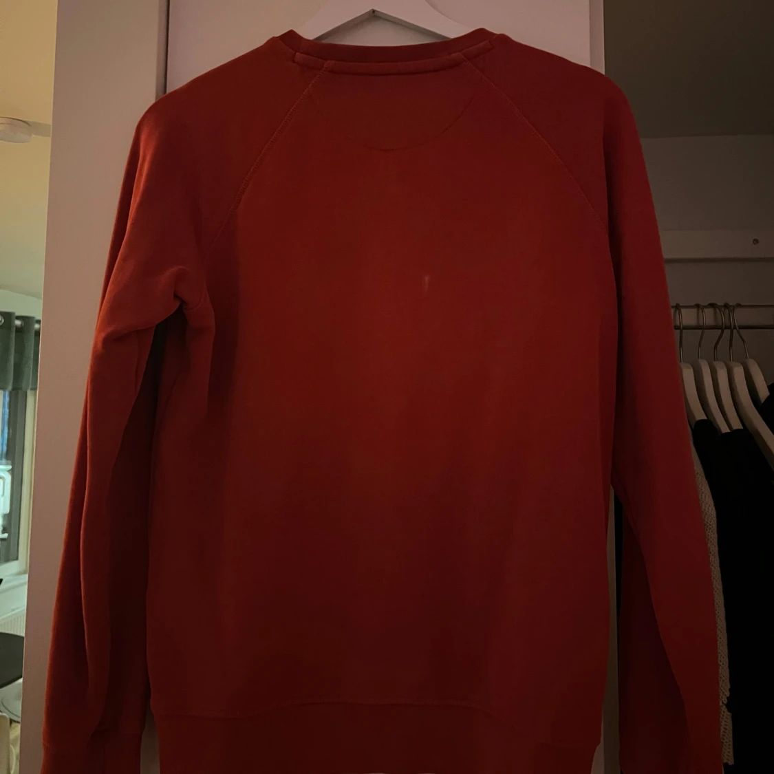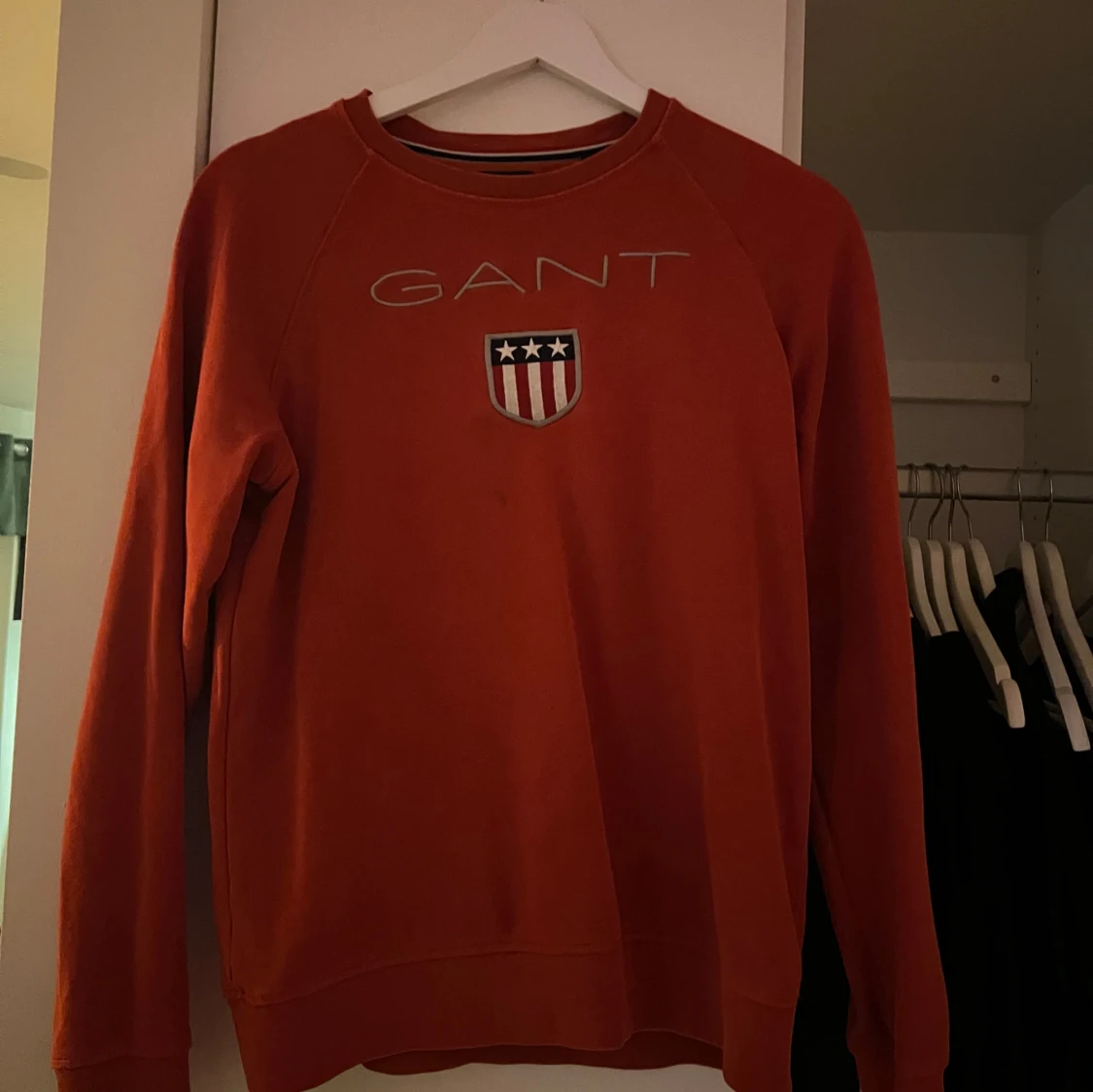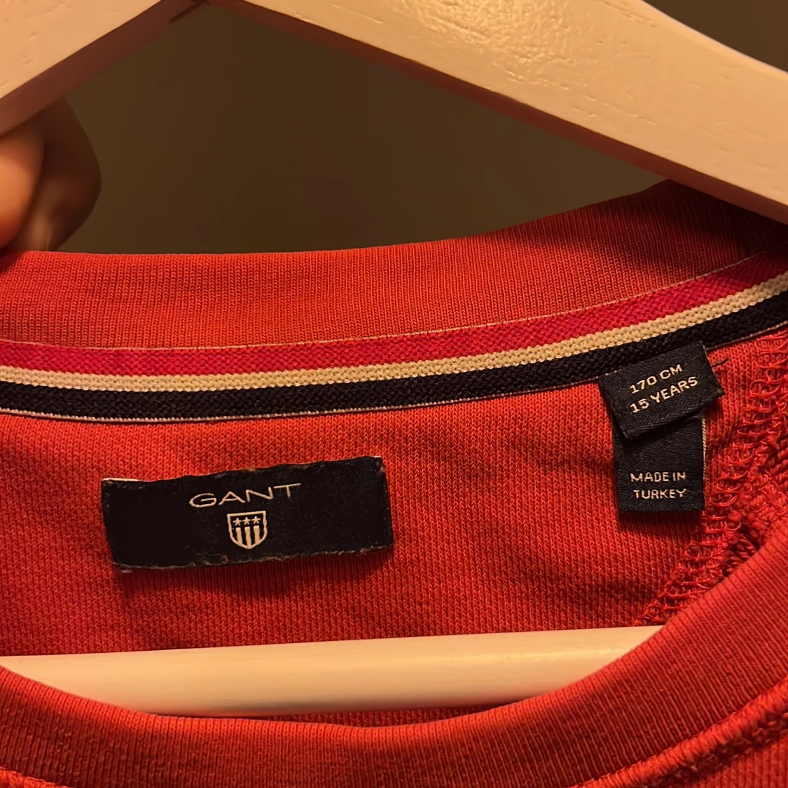 Säljer en röd gant sweatshirt. Köpt från kidsbrandstore. Är i jättefint skick förutom en liten blekt fläck på ryggen. Är barnstorlek men är stor i storleken.