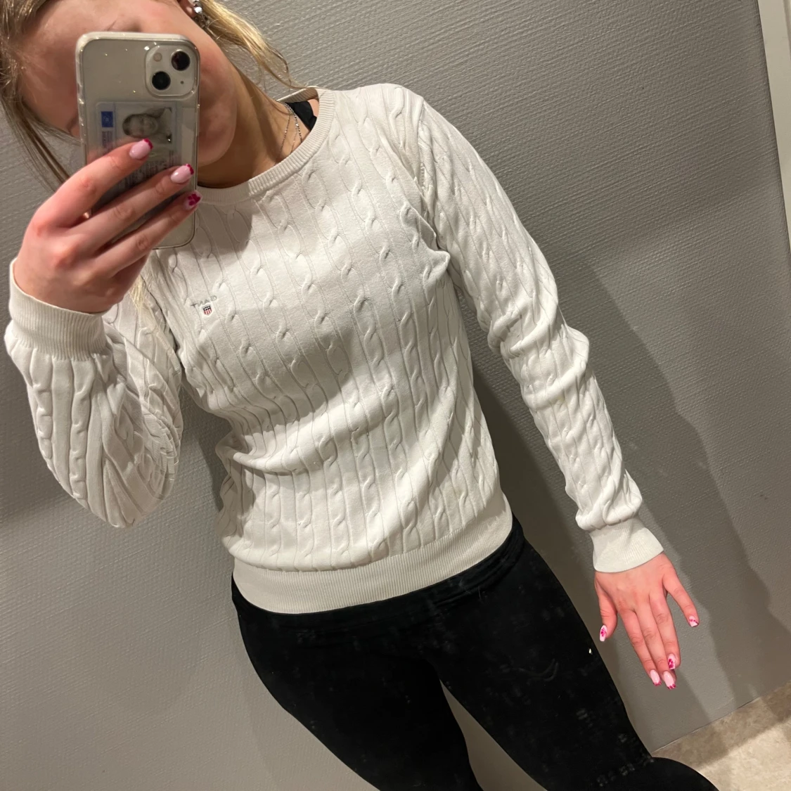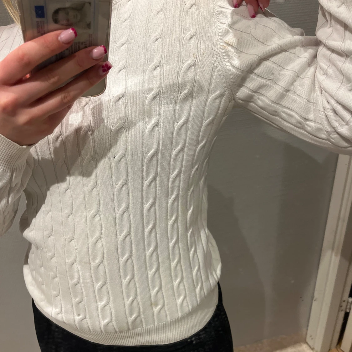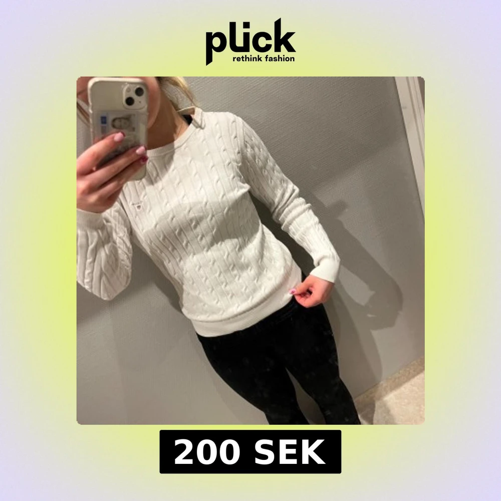 Säljer en stilren vit stickad tröja från Tommy Hilfiger med kabelstickat mönster. Tröjan har långa ärmar och en rund halsringning. Perfekt för en klassisk och bekväm look. Den har ett märke vid axeln se bild tre❤️