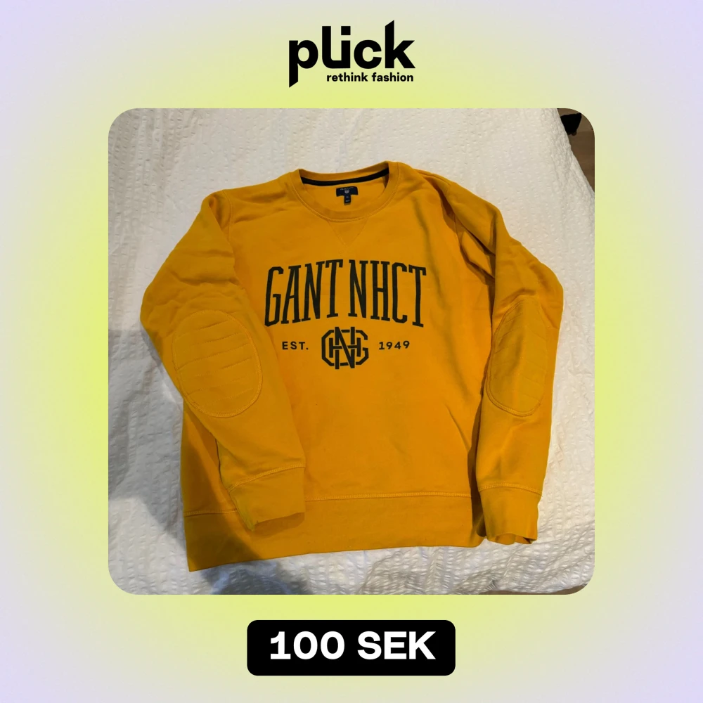 Säljer en snygg gul sweatshirt från GANT i storlek XL. Tröjan har ett tryck med texten 'GANT NHCT'. Den är i bra skick. Ribbstickade muddar och krage. Rund halsringning. Normal passform. Mjuk bomull.