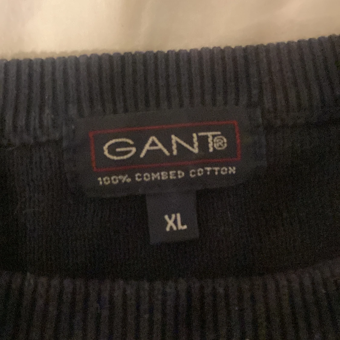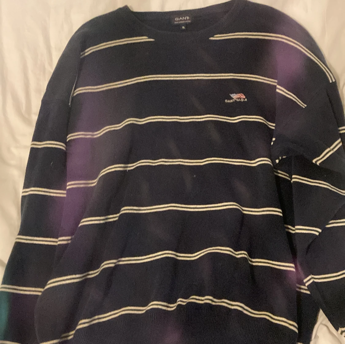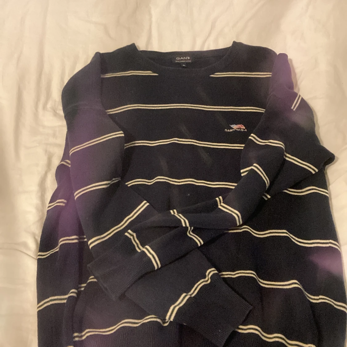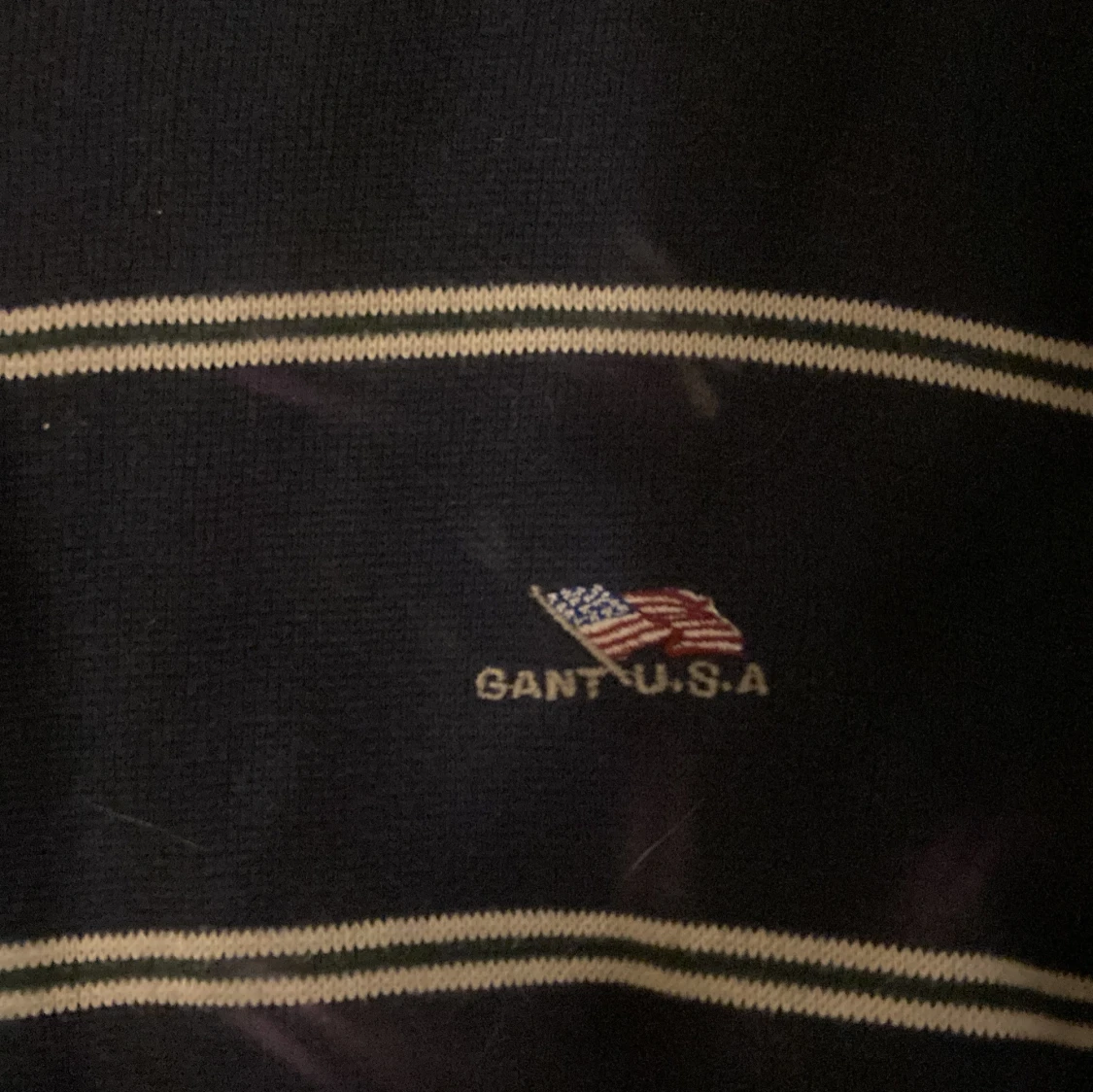 Säljer en klassisk marinblå tröja från GANT i storlek XL. Tröjan har vita horisontella ränder och en broderad amerikansk flagga med GANT U.S.A på bröstet. Tillverkad i 100% kammad bomull, med rund hals och långa ärmar. Perfekt för dig som gillar preppy stil.