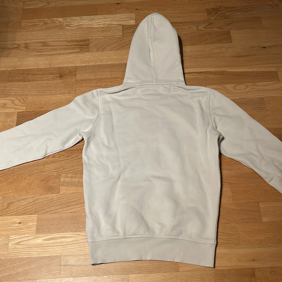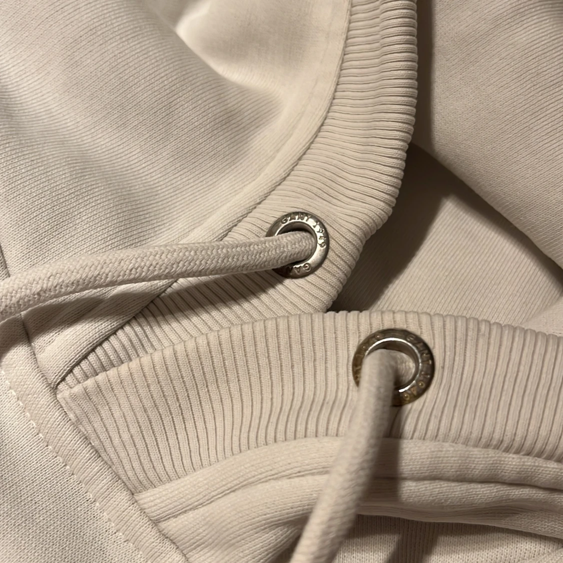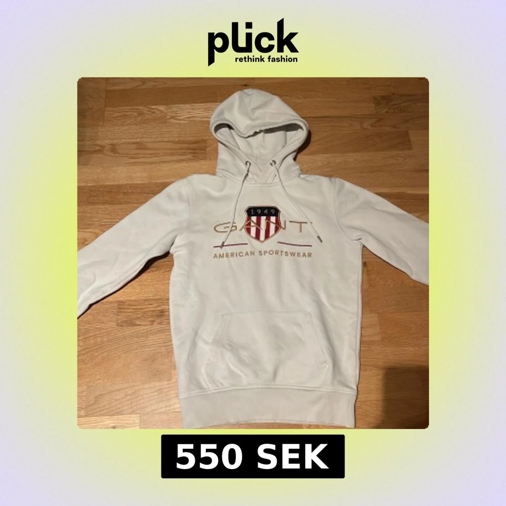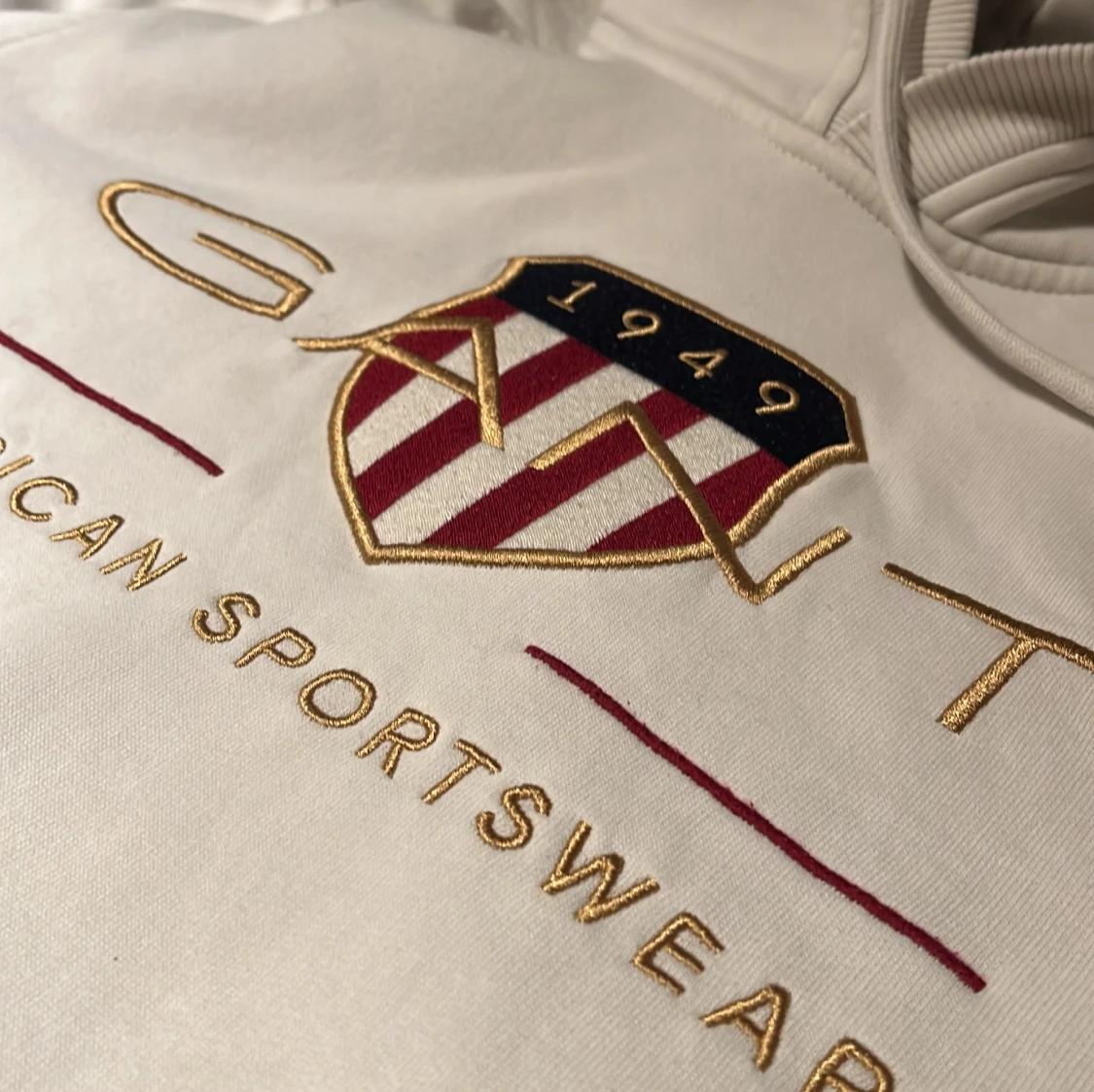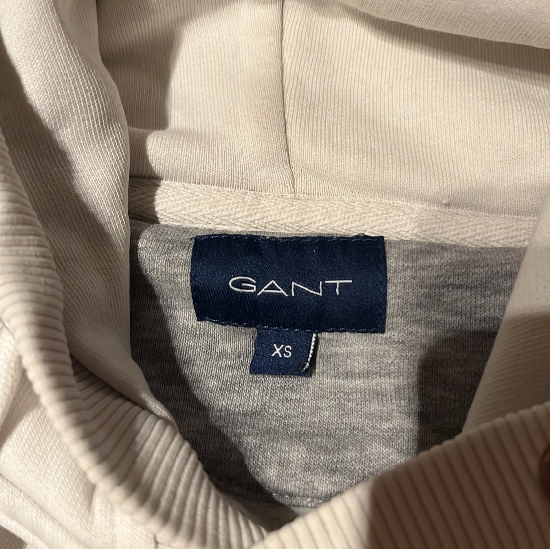 Säljer en stilren vit hoodie från GANT med broderad logga och texten 'American Sportswear' på framsidan. Hoodien har en praktisk ficka framtill och justerbar huva med snören.