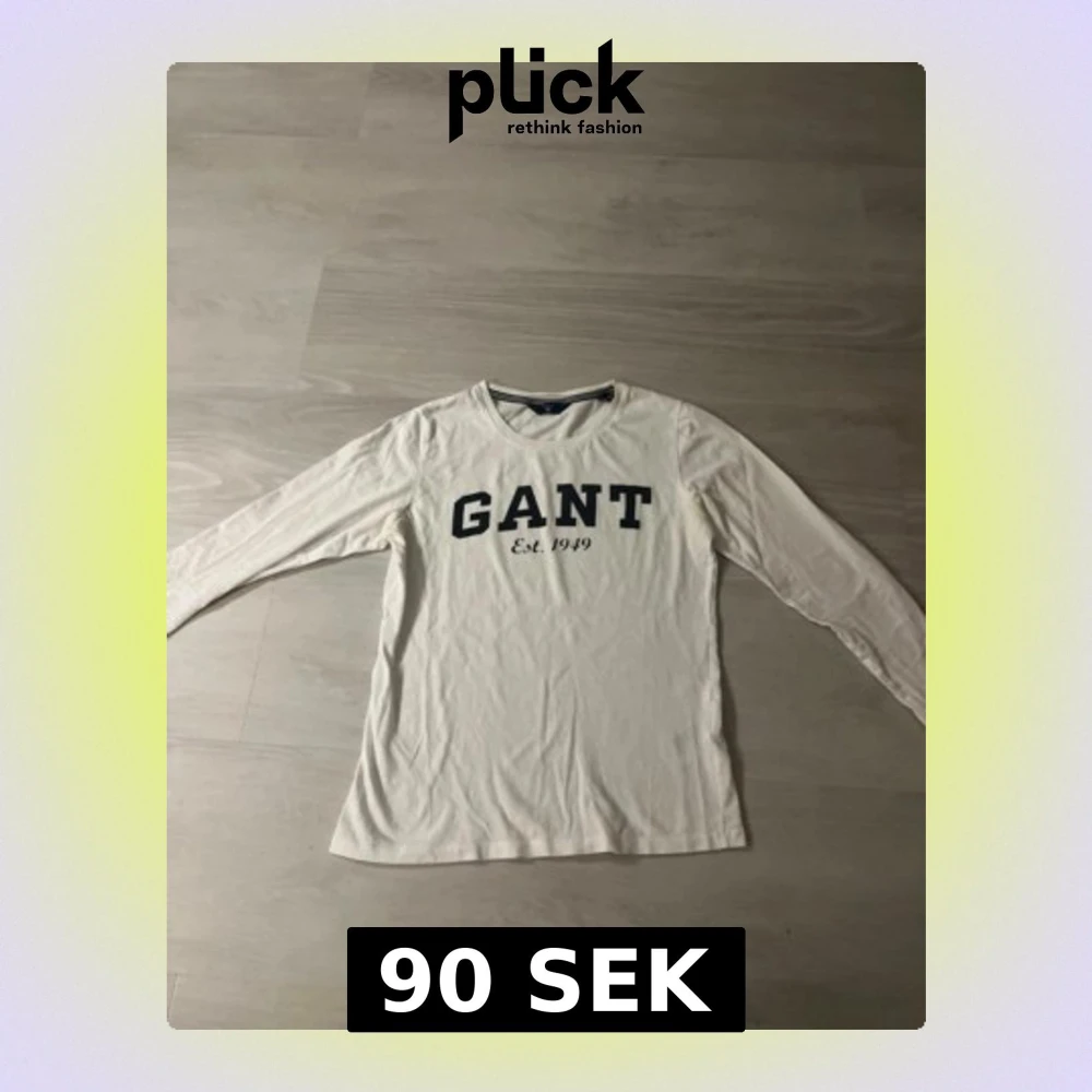 Vit långärmad tröja från GANT med stor mörkblå logotyp och texten 'Est. 1949' på bröstet. Rund halsringning med ribbad kant och mjukt bomullsmaterial. Perfekt för dig som gillar klassisk och enkel stil med tydlig branding.
