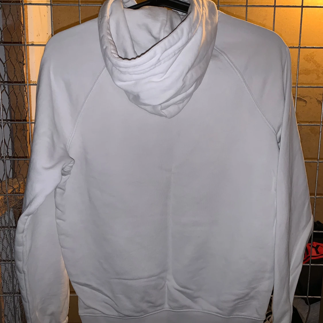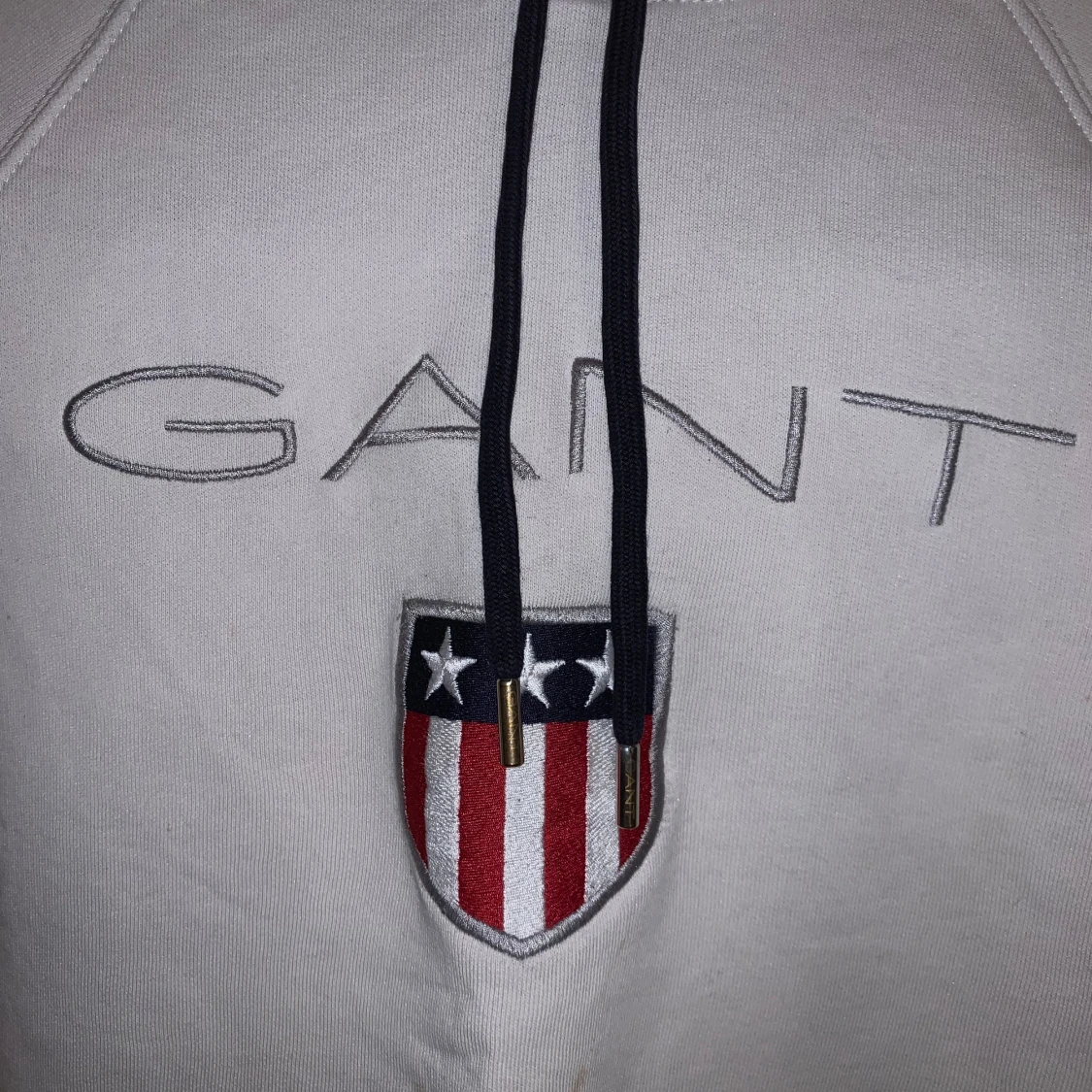 Säljer en stilren vit hoodie från GANT med broderad logga och ett emblem på bröstet. Hoodien har en klassisk känguruficka och justerbar dragsko i huvan. Perfekt för en avslappnad stil.