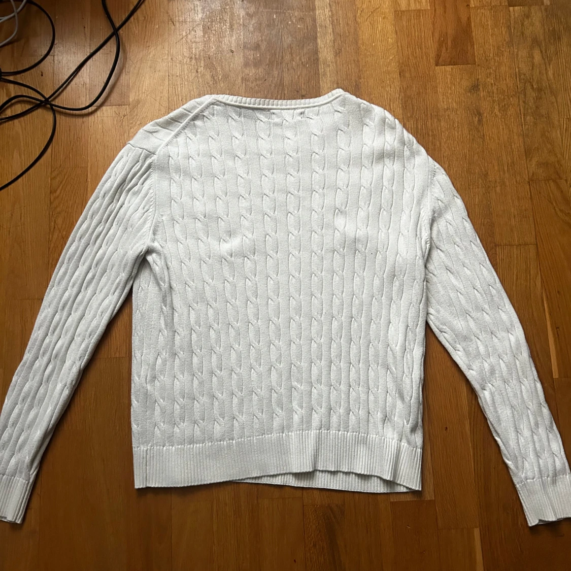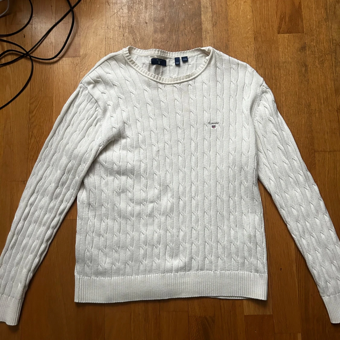 Säljer en stilren vit stickad tröja från Gant med kabelstickat mönster. Tröjan har långa ärmar och en rund halsringning. Är i storlek 170. Kan skicka direkt. 900 nypris