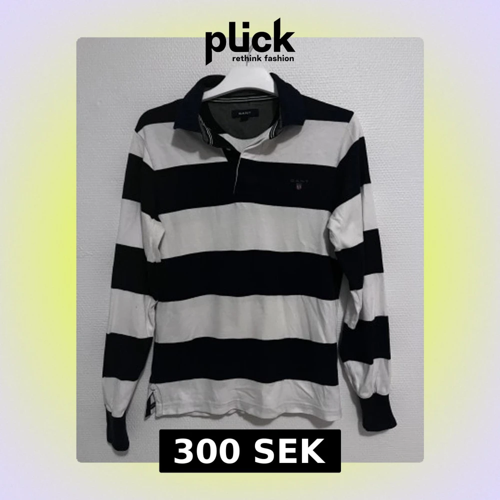 Snygg långärmad pikétröja från GANT i storlek XS. Tröjan har breda marinblå och vita ränder. Perfekt för dig som gillar att ha något som sticker ut.