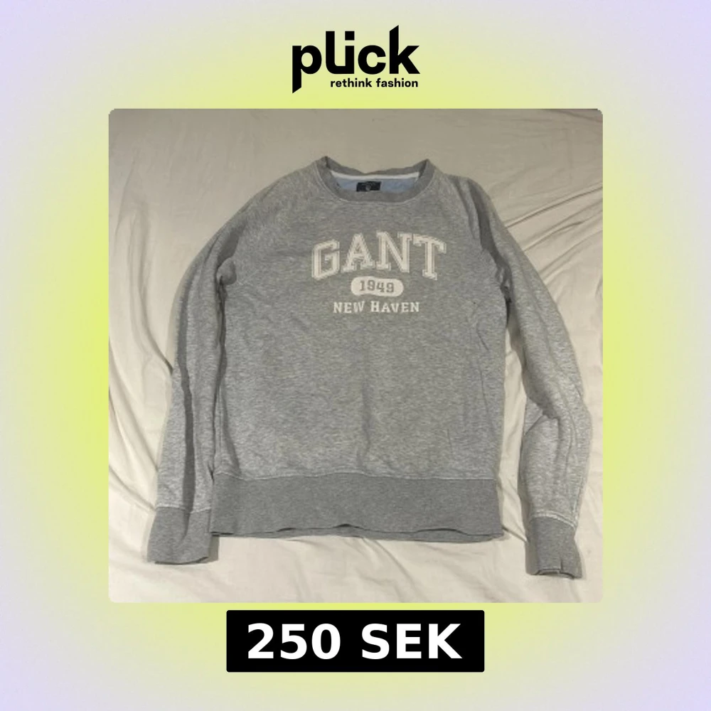 Snygg grå sweatshirt från GANT i storlek XS med tryck 'GANT 1949 NEW HAVEN' framtill. Tröjan har rund halsringning, långa ärmar och breda muddar vid ärmslut och nederkant. Perfekt för en chill och sportig look.