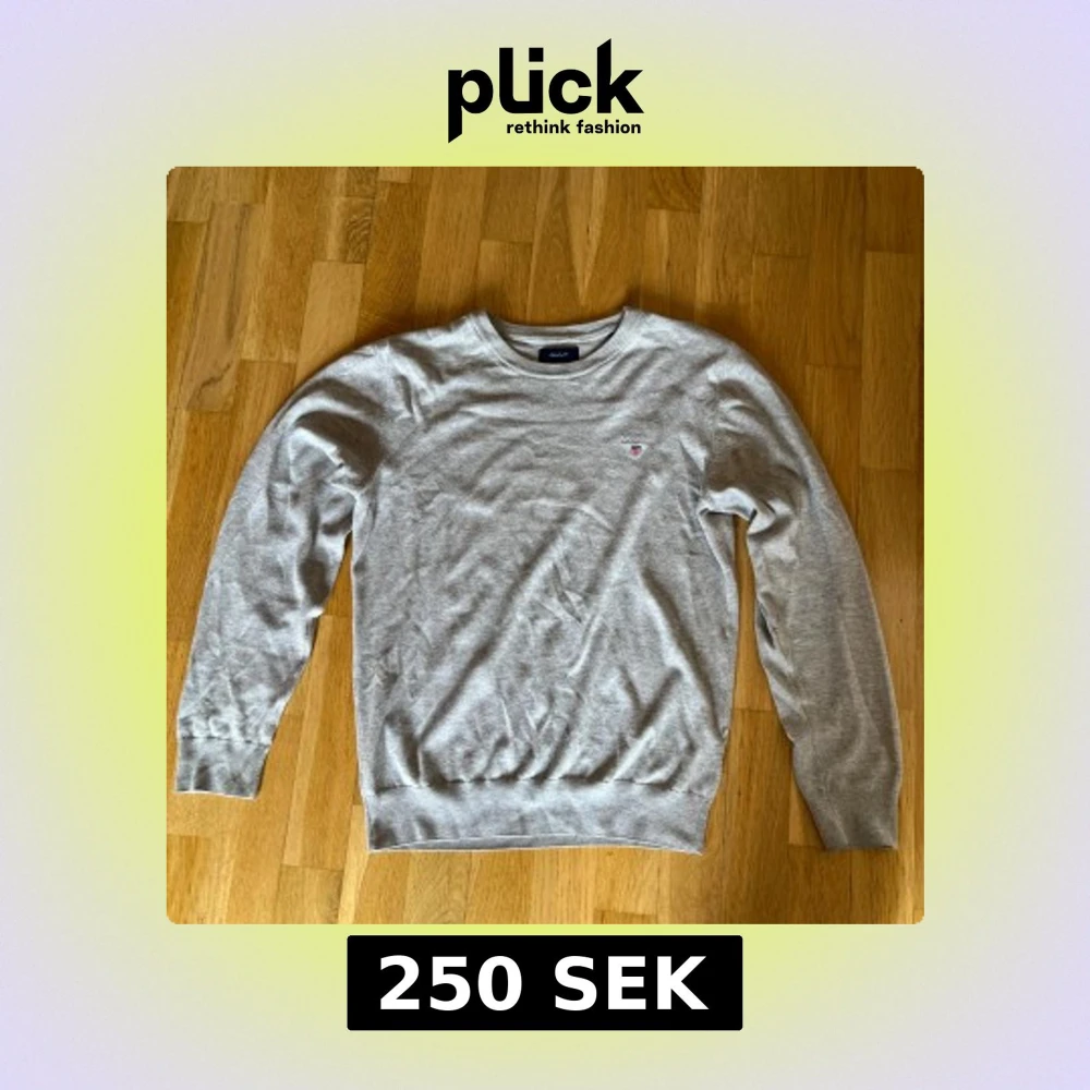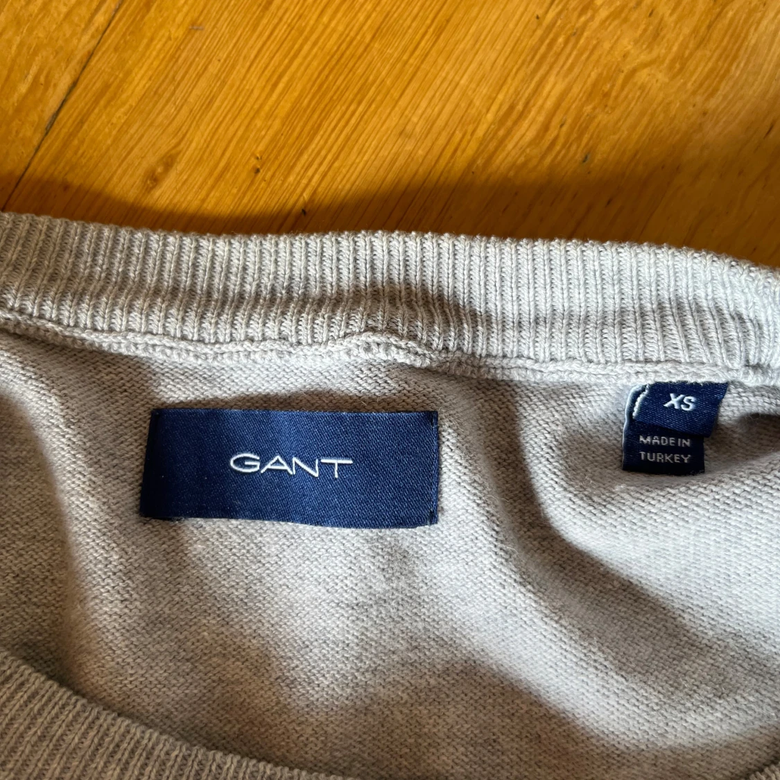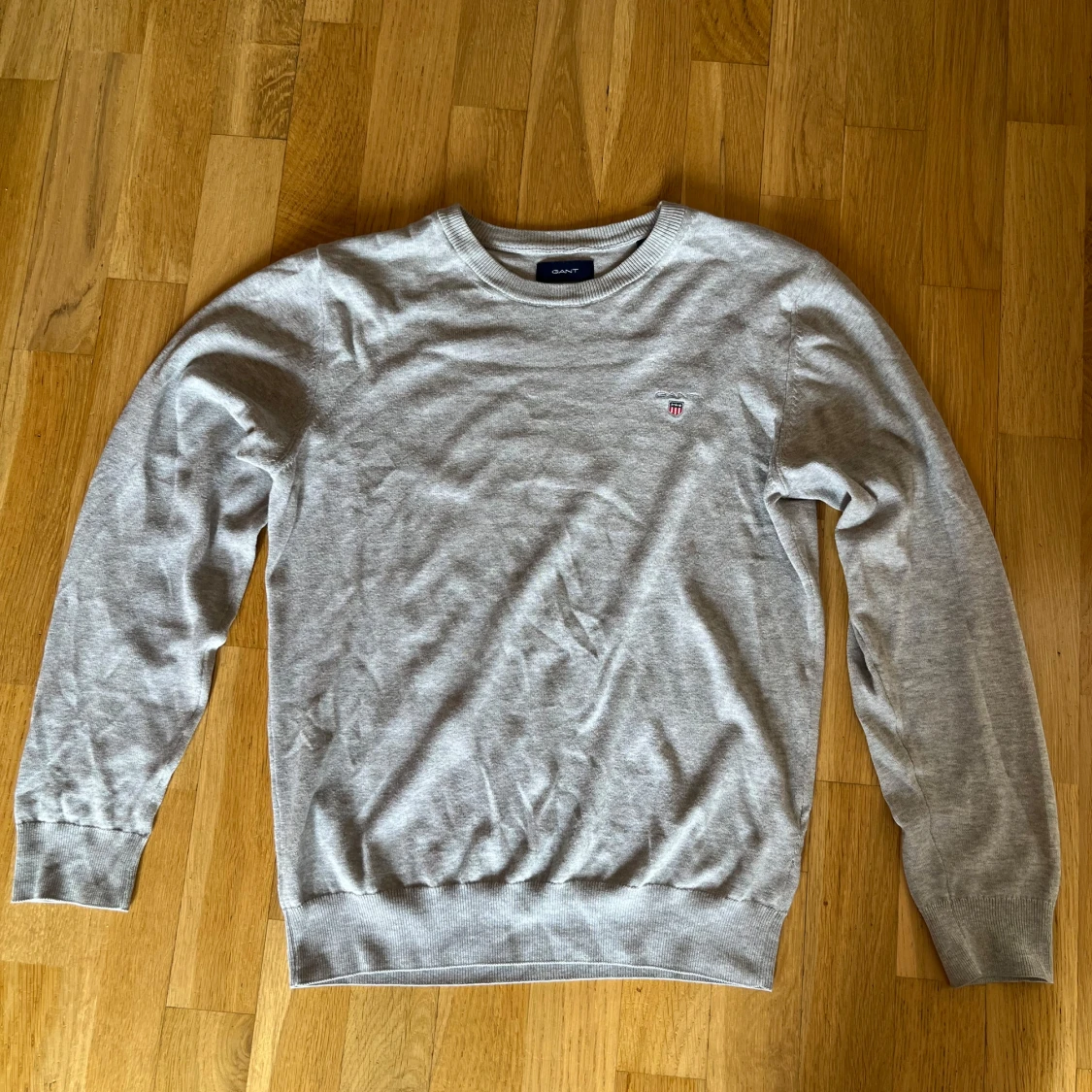 Snygg grå stickad tröja från GANT i storlek XS. Klassisk rund hals och diskret broderad logga med sköld på bröstet. Mycket fint skick